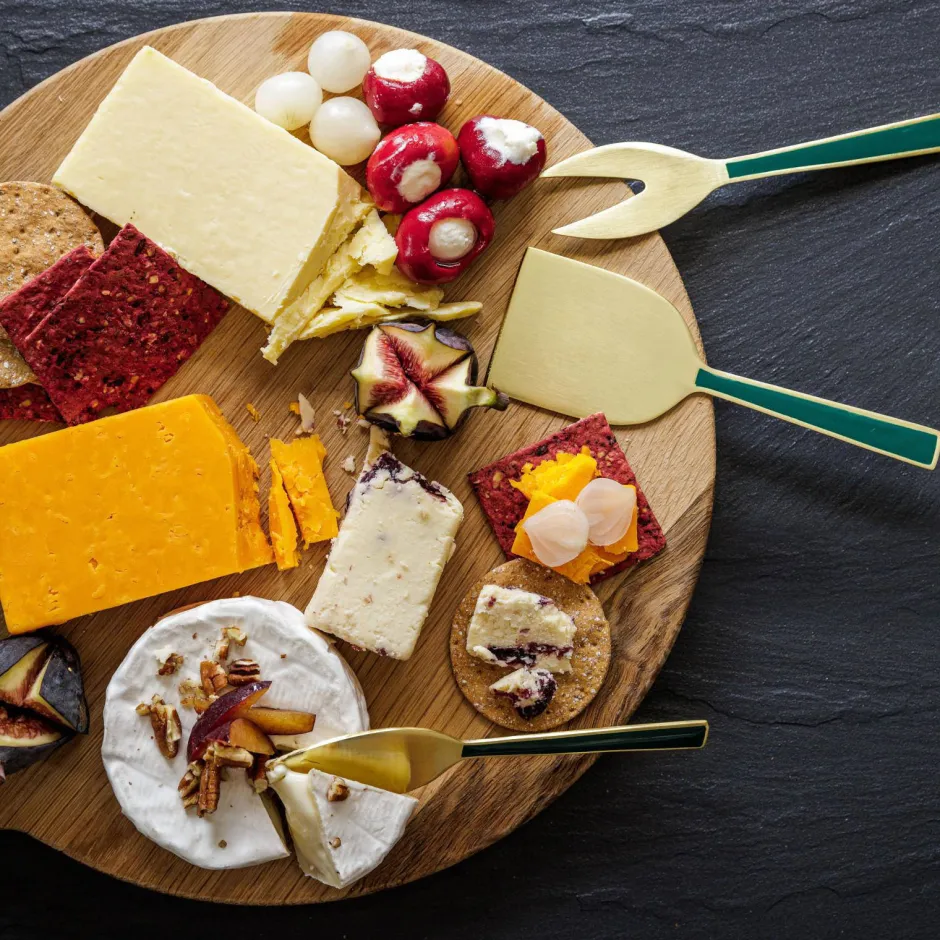 Deze Luxe Kaasbestekset Van Artesa Is De Perfecte Aanvulling Op Elke Kaasplank. Snijd En Serveer Verschillende Soorten Kaas Bij Speciale Gelegenheden Met Deze Prachtige Set Die Bestaat Uit 1 X Spade Mes, 1 X Plat Kaasmes En 1 X Vork. Gemaakt Van Verguld Roestvrij Staal Met Smaragdgroene Emaillaag, Heeft Het Ontwerp Een Organische Vorm Met Weelderige Gouden Randen, Waardoor Deze Kaasmessen Licht En Comfortabel In Gebruik Zijn.