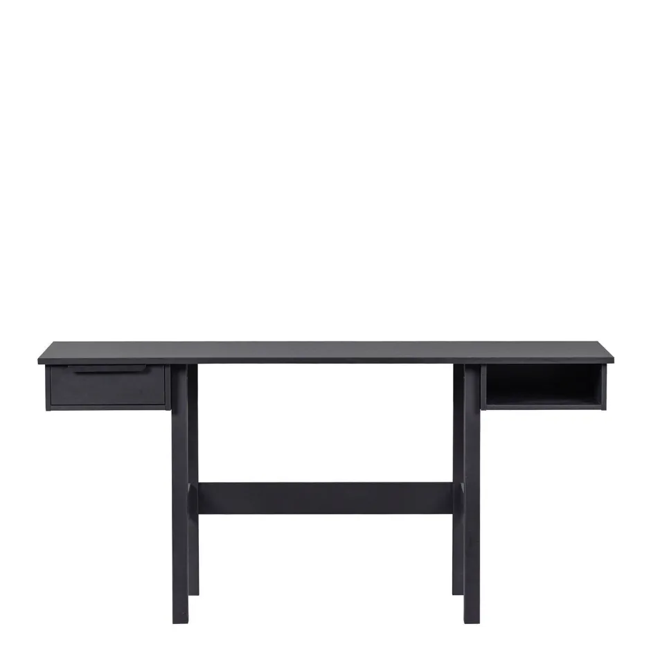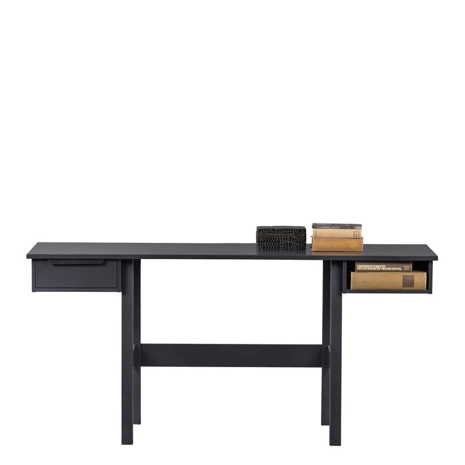Onder Het Werkblad Van Het Bureau (160 Cm Breed) Zijn Twee Opbergmogelijkheden Te Vinden. Een Open Vak En Een Lade Voorzien Van Zwart Metalen Greep. Afstand Van De Grond Tot Aan Het Werkblad Is 73 Cm, Houdt Hier Rekening Mee Bij Het Aanschaffen Van Een (Bureau) Stoel Met Armleuningen.