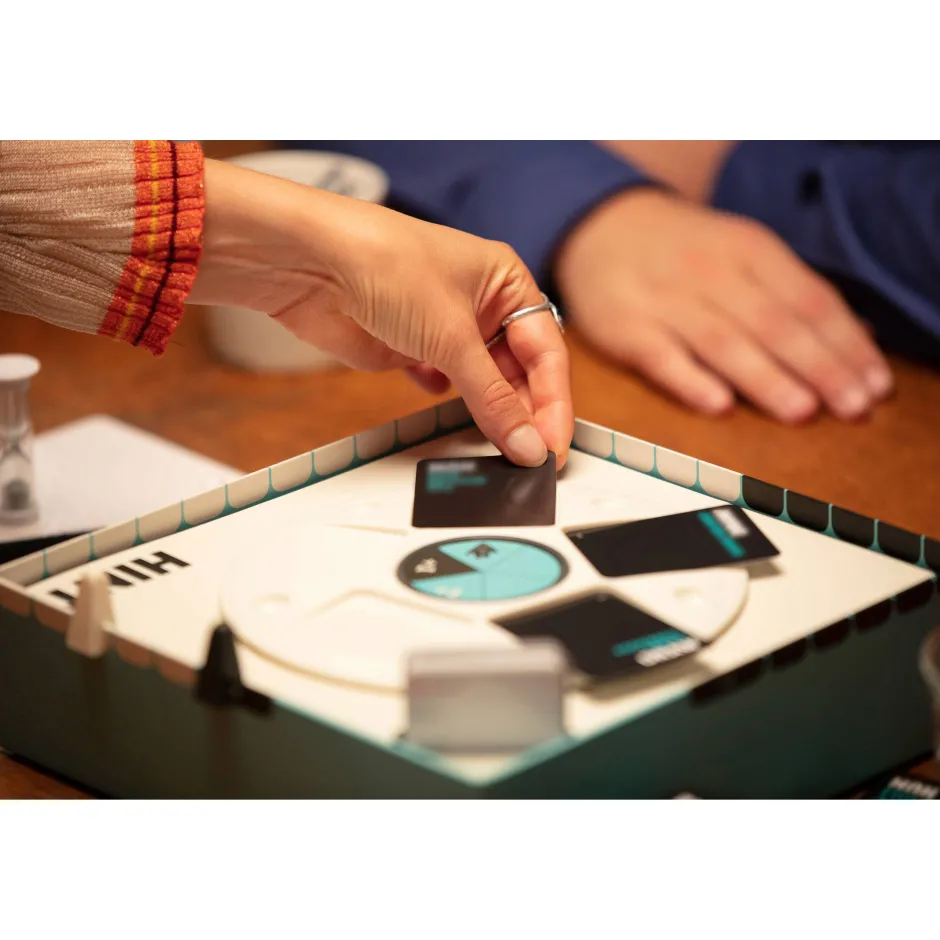 Een Partyspel Van De Makers Van Bezzerwizzer: Hint! Tijdens Het Partyspel Hint Laat Je Jouw Teamgenoten Begrippen Raden Door Middel Van Praten, Tekenen, Uitbeelden Of Neurien. Speel Hint Om Een Hint Te Krijgen, Een Hint Te Geven En Als Je Echt Goed Bent, Een Hint Te Stelen. Maar Kijk Uit Voor De Verboden Begrippen… Uitdagend Veel Speelplezier Met Maar Liefst 450 Kaarten! Het Spelverloop Is Eenvoudig: Kies Een Kaart Uit Het Kaartwiel (Of Wordt Verplicht Tot Het Nemen Van Een Bepaalde Kaart!) En Geef Jouw Teamgenoten Zo Snel Mogelijk Hints Door Middel Van Praten, Tekenen, Uitbeelden Of Neurien. De Kaart Toont Aan Welke Manier Gebruikt Mag Worden. Je Krijgt 90 Seconden De Tijd Om 5 Correcte Begrippen Te Raden. Raad Echter Niet Zomaar In Het Wilde Weg, Want Elke Kaart Bevat Ook Een Verborgen Begrip Dat Je Beter Niet Kunt Noemen! Een Team Krijgt 1 Punt Voor Elk Goed Geraden Begrip. Maar Als Het Team Het Verboden Begrip Raadt, Verliest Het 2 Punten… Zodra De Tijd Op Is En Niet Alle Begrippen Geraden Zijn, Mag Het Andere Team Ook Nog Een Gokje Wagen Voor Bonuspunten. Des Te Beter Je Hints Zijn, Des Te Sneller Worden Alle Begrippen Geraden En Scoor Je De Meeste Punten. Voor Elk Punt Verschuif Je Jullie Pion Verder Richting De Finish Over Een Scorepad. De Teams Spelen Om De Beurt En Het Team Dat Als Eerste De Finish Bereikt, Wint Hint! Inhoud: 1 Afdekbord, 1 Kaartwiel, 2 Pionnen, 450 Kaarten, 1 Uitwisbaar Tekenbord, 1 Stift, 1 Wisdoekje, 1 Zandloper, 1 Stickervel En 1 Instructiekaart.