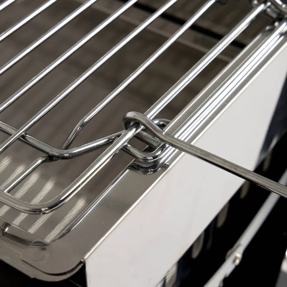Een Zeer Compacte Houtskool Barbecue Met Industriele Uitstraling. Als Koffermodel Erg Compact Opvouwbaar (Lxbxh: 9X40,5X26 Cm) En Zeer Gemakkelijk Mee Te Nemen Met Het Handvat. Het Barbecue Gedeelte Is Gemaakt Van Roestvrij Staal. Daarnaast Is Het Rooster Omhoog Te Plaatsen Bij Teveel Warmte. Voorzien Van Ventilatiegaten Aan De Zijkanten. Ideaal Voor Op Vakantie Maar Ook Thuis In De Tuin.