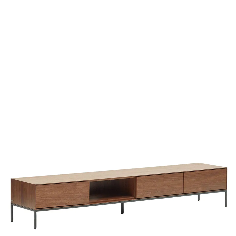 Tv-Meubel Gemaakt Van Walnootfineer. 3 Laden Met Verborgen, Verstelbare Geleiders En Push-To-Open Mechanisme. Verstelbare Stalen Poten Met Een Matte Antraciet Gelakte Afwerking. Kave Cares Design: Gemaakt Van E0 Gefabriceerd Hout Met Lage Formaldehyde Uitstoot, Om De Planeet Schoner Te Maken Van Schadelijke Stoffen. Exclusief Ontwerp, Gemaakt Door Het Kave Home Team.