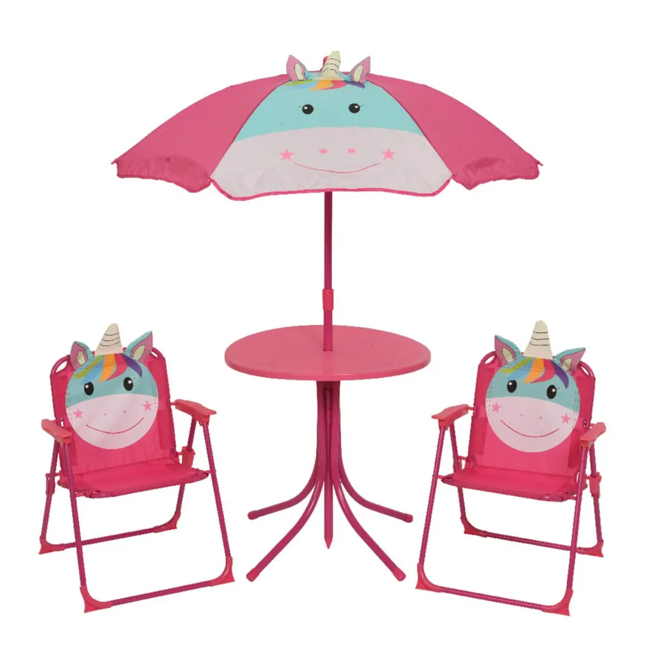 Deze Tuinset Is Vrolijk En Functioneel. Jouw Kindje Kan Op Deze Tuinset Makkelijk Zelf Eten En Drinken Of Buiten Kleuren Of Lezen. De Set Bestaat Uit Twee Klapstoelen, Een Tafel En Een Parasol Die Stevig Bevestigd Is In De Tafel. De Parasol En De Stoeltjes Hebben Een Afbeelding Van Een Unicorn. Zo Heeft Je Kindje Altijd Een Eigen Plekje!