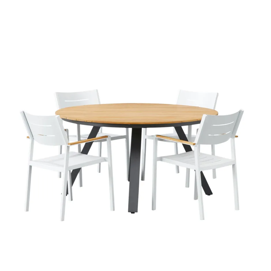 Deze Tuinset Is Van Het Merk Wehkamp Home En Bestaat Uit De Ronde Tuintafel Scarlet En Vier Austin Tuinstoelen. De Tafel Is Geschikt Voor 6 Personen. Het Frame Van De Tuintafel Is Gemaakt Van Aluminium. Het Tafelblad Is Gemaakt Van Teakhout. De Tuinstoelen Zijn Van Aluminium Gemaakt En Hebben Armleuningen Van Teakhout. Heb Je De Stoelen Een Tijdje Niet Nodig? Dan Kan Je Deze Gewoon Weer Opstapelen. Deze Tuinset Is Ook Verkrijgbaar Met Zes Tuinstoelen En Met Een Acaciahouten Tafelblad.