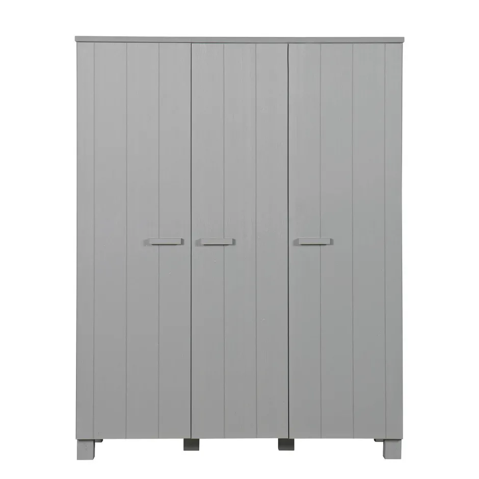 Deze Woood 3-Deurs Kledingkast Dennis Past Perfect In De Stoere (Kinder) Slaapkamer. Deze Houden Kast Op Pootjes Is Gelakt In Een Betongrijze Kleur Met Een Geborstelde Afwerking En De Deuren Hebben Een Verticale V-Groef Belijning. De Kast Heeft Aan De Linkerkant Een Legplank Met Daaronder Een Roede Om Kleding Aan Op Te Hangen. Aan De Rechterkant Heeft De Kast Vier Kleinere Legplanken. Genoeg Ruimte Om Al Je Kleren Op Te Bergen. Alle Delen Van De Kast Die Je Ziet, Zijn Gemaakt Van Gelakt Grenen. De Legplanken En De Achterkant Bestaan Uit Spaanplaat. De Nerven En Noesten In Het Hout Blijven Zichtbaar Wat De Kast Een Extra Robuust Karakter Geeft En Is Ieder Exemplaar Uniek.