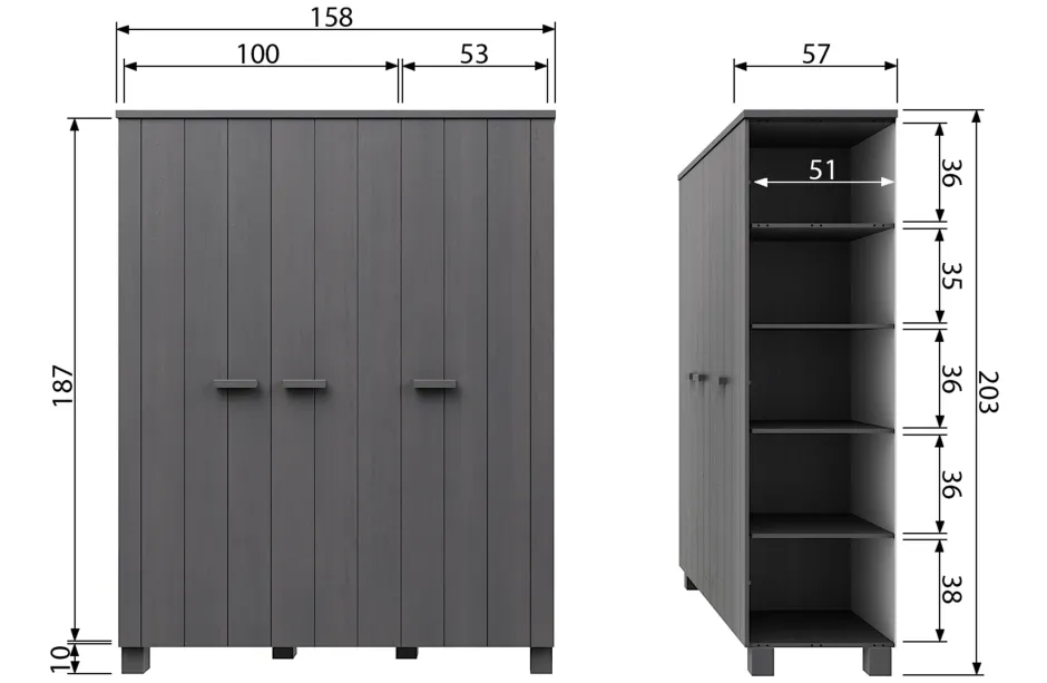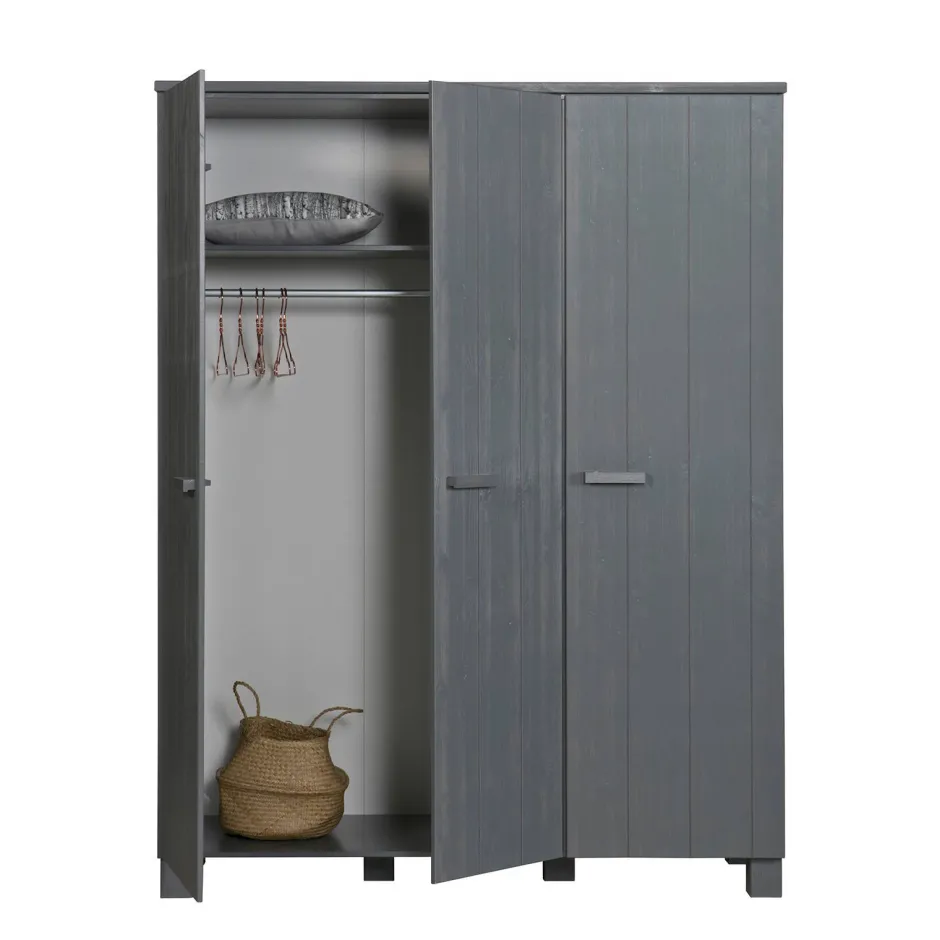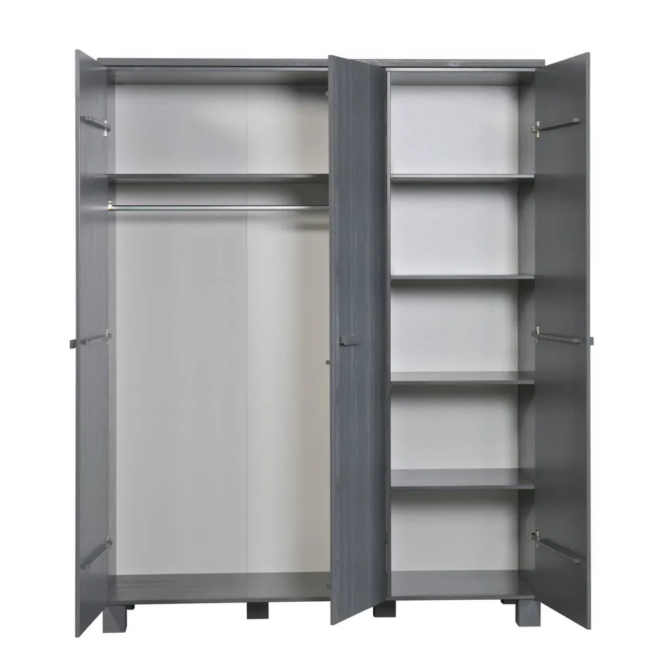 Woood Dennis Kast (H 202 X B 158 X D 55 Cm) Is Een Stoere, Praktische En Moderne Kast Uit De Collectie Van Het Nederlandse Merk Woood. De Dennis Kast Is Gemaakt Van, Fsc Gecertificeerd, Grenenhout Met Een Staal Grijze Finish En Heeft Een Geborstelde Afwerking. De Deuren Hebben Een Verticale V-Groef Belijning. Het Interieur Van De Dennis Kast Is Van Melamine En Bestaat Uit Een Brede Legplank Bovenin Met Daaronder Aan De Linker Kant Een Roede En Aan De Rechter Kant Drie Legplanken.