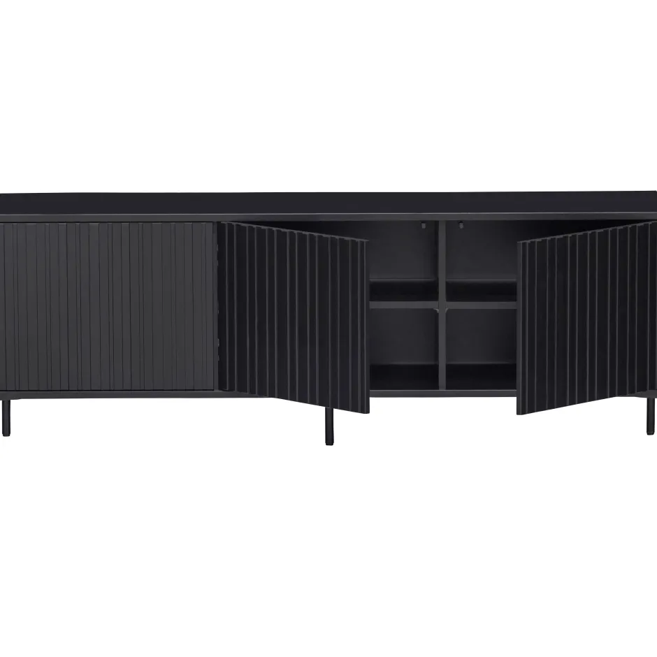Onze Succesvolle Gravure Serie In Een Nieuw Jasje! Dit Gravure New Tv-Meubel, Uit De Collectie Van Het Nederlandse Interieurmerk Woood, Is Verkrijgbaar In Twee Formaten: 100 Cm Breed En 150 Cm Breed. Gravure New Tv-Meubel Is Uitgevoerd In Grenenhout En Afgewerkt Met Een Diepzwarte Lak. Het Interieur Is Vervaardigd Uit Spaanplaat In Zwart. De Poten Zijn Van Metaal Met Een Zwarte Coating. Het Gravure New Tv-Meubel Beschikt Over Drie Deuren Met Een Geluidloos Push-To-Open Systeem.