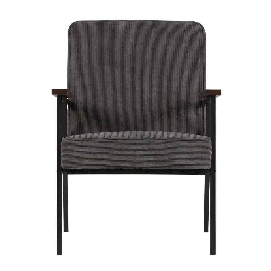 Woood Sally Fauteuil 87X65X82 (Hxbxd) Is Een Comfortabele Fauteuil. De Sally Fauteuil Is Gestoffeerd Met Een Stevige Ribcord Stof In De Kleur Antraciet En Heeft Een Zwart Gelakte Metalen Frame. De Bruin Gelakte Houten Armleggers Geven Deze Fauteuil Een Stoer, Trendy En Casual Uiterlijk.