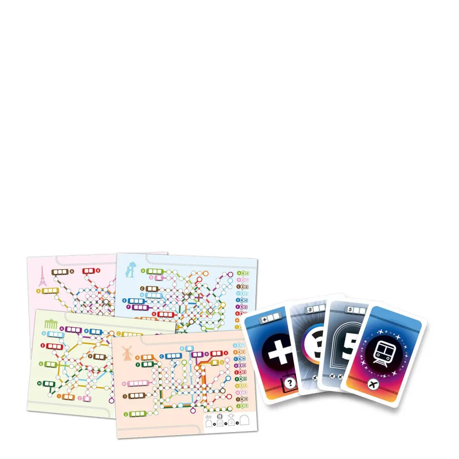 Bouw De Meest Waardevolle Metrolijn! [Met Sierletter Aan Het Begin] In Metrolijn Ga Je Punten Scoren Door Zo Slim Mogelijk Je Metro’S Bij Haltes Te Laten Stoppen. Elke Route Waarvan Je Alle Haltes Weet Aan Te Kruisen Levert Punten Op. Maar Het Aantal Metro’S Per Route Is Beperkt! Zodra Je Je Laatste Metro Hebt Laten Rijden, Worden De Punten Geteld. Dit Spel Is Geen Roll & Write, Maar Een Flip & Write. Per Beurt Wordt Een Kaart Omgedraaid, Die Aangeeft Bij Hoeveel Haltes Je Moet Stoppen. Op Je Scorevel Staat Het Metronetwerk Van Steden Als Berlijn, Madrid Of Parijs. Je Kiest Een Metro Op Je Scorevel En Kruist Een Voor Een Opeenvolgende Haltes Van Deze Metrolijn Aan. Je Stopt Als Je Het Maximale Aantal Haltes Van Deze Beurt Hebt Aangekruist, Of Als Je Op Een Eerder Aangekruiste Halte Uitkomt. Sommige Kaarten Hebben Speciale Functies. Kaarten Met Overstapstations Laten Je Bijvoorbeeld Extra Bonuspunten Op Kruispunten Verdienen. De Kaart “Gratis Reizen” Laat Je Een Willekeurige Halte Aankruisen. Met Sneltreinkaarten Kun Je Over Eerder Aangekruiste Metrohaltes Heen Stappen. Metrolijn Bevat Vier Verschillende Scorevellen Voor Meer Variatie. Zo Kun Je Metrolijnen Aanleggen In Parijs, Berlijn, Madrid En Amsterdam. Metrolijn Is Zowel Een Gezellig En Snel Spelletje Voor Tot Zes Personen Als Een Uitdagende Puzzel Voor Solospelers.