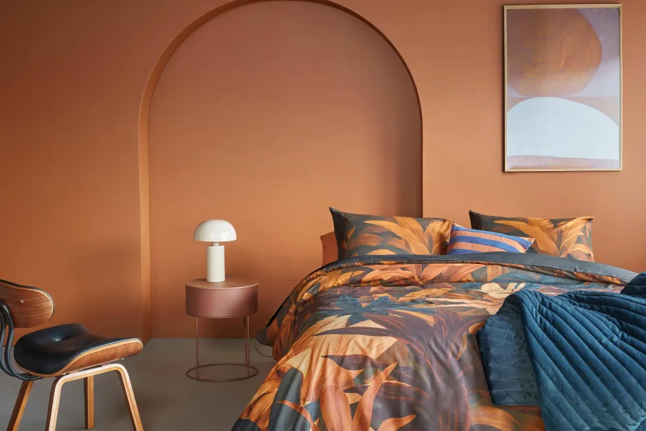 Speel In Op De Botanische Trend Met Dekbedovertrek Keano Van Beddinghouse. Het Overtrek Bestaat Uit Een Print Van Grote Bladeren Die Over Elkaar Heen Zijn Geplaatst. Door De Gelaagdheid En De Kleurencombinatie Van Rood- En Blauwtinten Geeft Dit Dekbedovertrek Je Slaapkamer Een Warme Uitstraling. De Achterzijde Van Het Overtrek Heeft Een Effen Donkerblauwe Kleur.