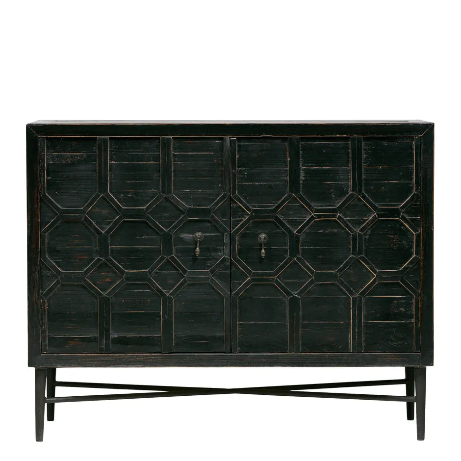 Het Dressoir Bequest Van Het Merk Bepurehome Is Gemaakt Van Oud Grenenhout Met Een Antiek Zwarte Afwerking. Het Dressoir Heeft 2 Openslaande Deuren, Die Bewerkt Zijn Met Een Oosters Patroon, Met Daarachter 2 Legplanken (Inclusief Bodem). Het Onderstel Is Gemaakt Van Metaal En Afgewerkt Met Een Donkere Roest Kleur.