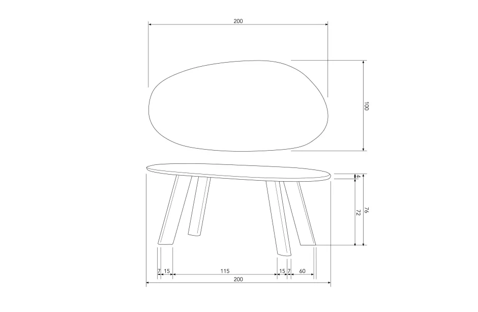 Hoogte: 76 Cm- Breedte: 200 Cm- Diepte: 100 Cm- Bladdikte: 4 Cm- Poothoogte: 72 Cm- Pootdikte: 15X7 Cm- Korte Afstand Poten: 44/60 Cm- Lange Afstand Poten: 80/115 Cm- Gewicht: 93 Kg- Draaggewicht: 150 Kg