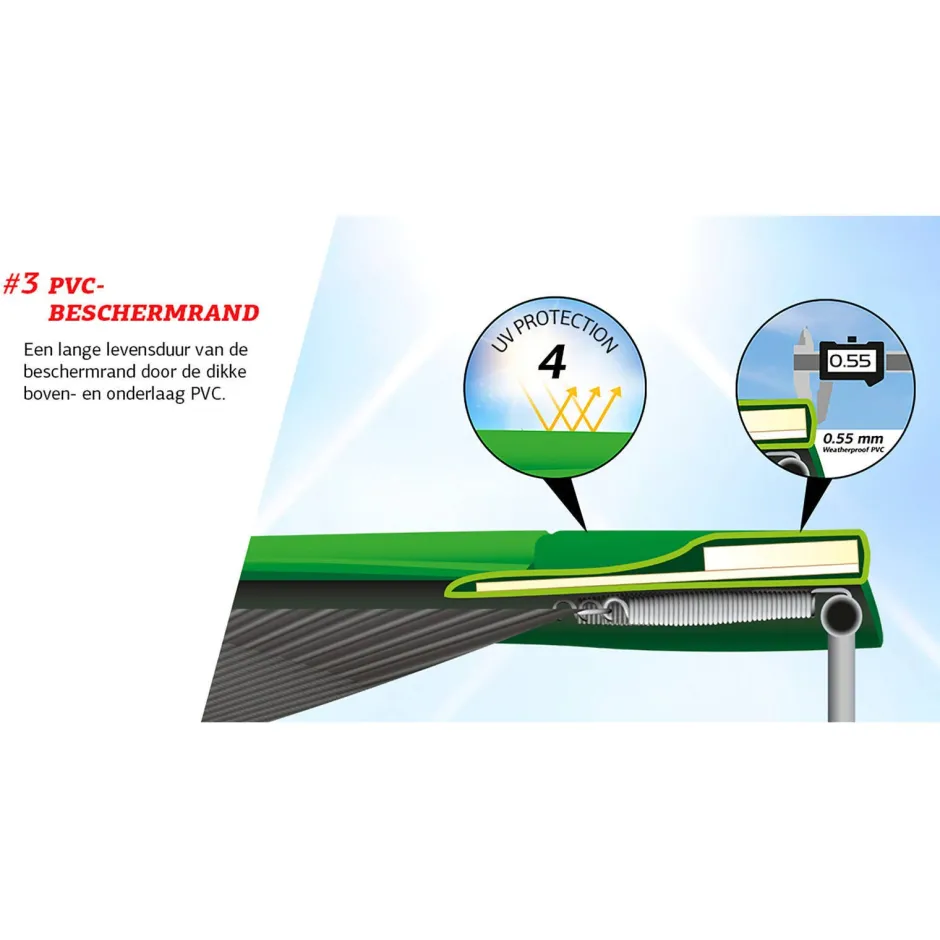 De Beschermrand Van Een Favorit Is Voorzien Van Een Stevige Schuimlaag Over De Hele Breedte. Deze Schuimlaag Bestaat Uit Het Waterafstotende ‘’Closed Cell Foam”. Het Schuim In De Beschermrand Wordt Omhuld Door Een Dikke, Weerbestendige Buitenlaag Van Versterkt Pvc. De Beschermrand Geeft Een Beschermende Overlap Van De Padding Over De Veren.