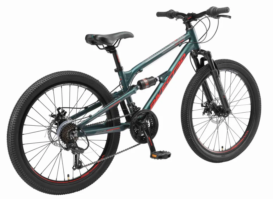 **Full Suspension Mountainbike** Zeer Stabiel Aluminium Frame Voor Dagelijks Gebruik Op De Berg, In De Stad Of Op School. Met Een Bandenmaat Van 24 Inch En Framemaat 13 Inch Is Hij Geschikt Voor Jongens Of Meisjes, Vanaf Ca. 140Cm. Met Het 21-Speed Shimano Derailleur-Systeem Met Bijna Naadloze Schakeling Kun Je Elke Situatie Aan. De Bijzonder Gripvaste Schijfremmen Aan De Voor- En Achterkant Zorgen Voor De Nodige Controle. De Fiets Heeft Een Geveerde Voorvork Met 55 Mm Veerweg En Een Geveerde Achterbrug.**Bikestar Kwaliteit** Bikestar Is Gespecialiseerd In De Productie Van Hoogwaardige Fietsen Die Perfect Op Hun Taak Berekend Zijn. Daarom Worden Alleen Hoogwaardige Componenten Gebruikt, Die Bijdragen Aan De Veiligheid En Duurzaamheid Van De Fiets. De Fiets Wordt 90% Compleet Gemonteerd Afgeleverd. U Dient Zelf Nog De Pedalen, Zadel En Het Voorwiel Te Monteren. U Doet Er Goed Aan De Fiets Voor Het Eerste Gebruik Door Een Fietsenmaker Te Laten Controleren En De Fiets Om De Zoveel Maanden Een Onderhoudsbeurt Te Laten Geven Voor Een Lang En Veilig Gebruik.Bikestar Staat Al Tien Jaar Voor Een Productontwerp Dat De Harten Van Kinderen Inspireert. Met Zijn Merken Bikestar, Star-Scooter En Star-Skateboards Heeft Het Bedrijf Een Reusachtig Assortiment Kindervoertuigen Beschikbaar. De Firma Overtuigt Door Snelle Levering En Permanente Beschikbaarheid Van Reserveonderdelen.**Specificaties**- Leeftijd: 10-13 Jaar (Vanaf 140Cm Lengte)- Zadelhoogte: Ca. 67-77 Cm- Stuurhoogte: Ca. 87-89 Cm- Gewicht: 12 Kg- Wielmaat 24 Inch- Framehoogte: 13 Inch (33 Cm)- Versnellingen: 21 (Shimano)- Framemateriaal: 6061 Aluminium- Geveerde Voorvork Met 55 Mm Veerweg- Derailleur: Shimano Tourney Rd-Ty21- Schakelaar: Shimano Draaigreep- Cassette: Shimano Mf-Tz500- Remmen: Schijfremmen- Ketting: Kmc- Max. Toegestaan Gewicht: 70 Kg- 90% Voorgemonteerd