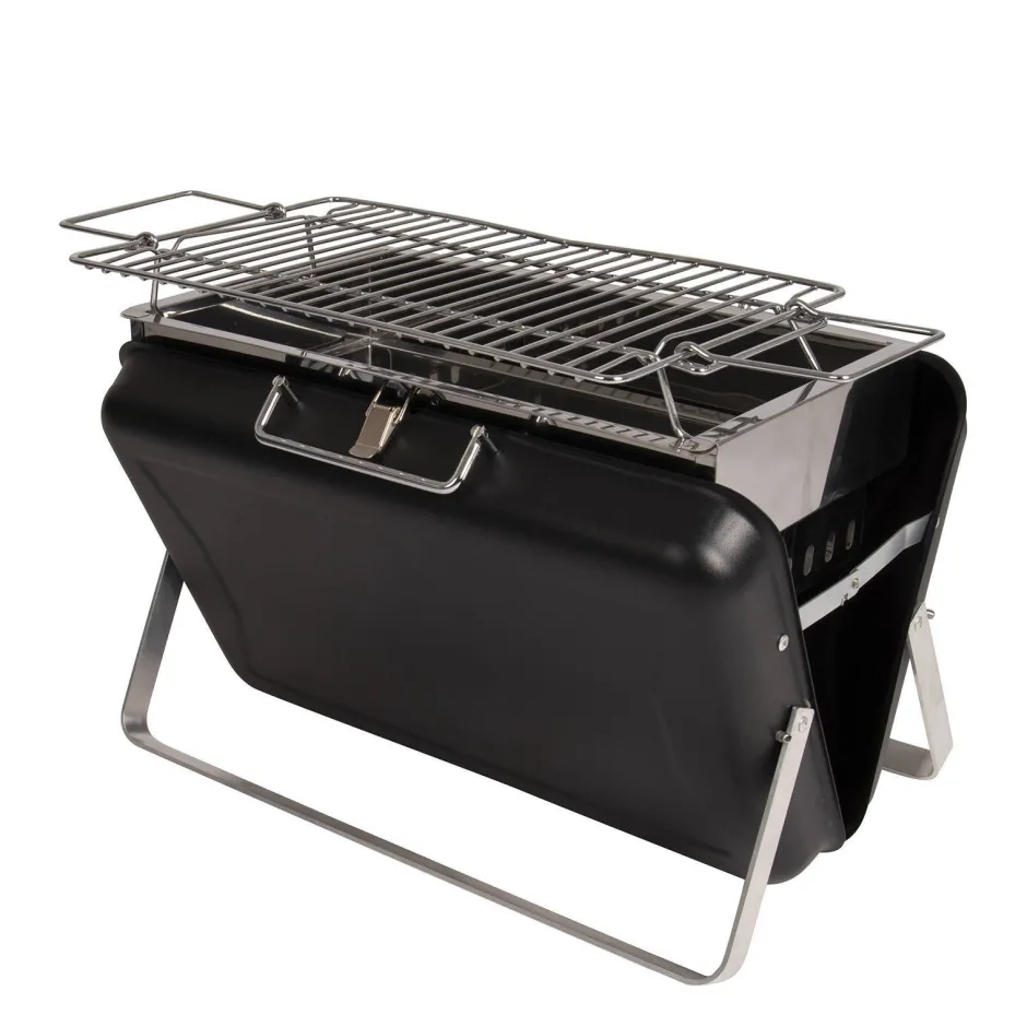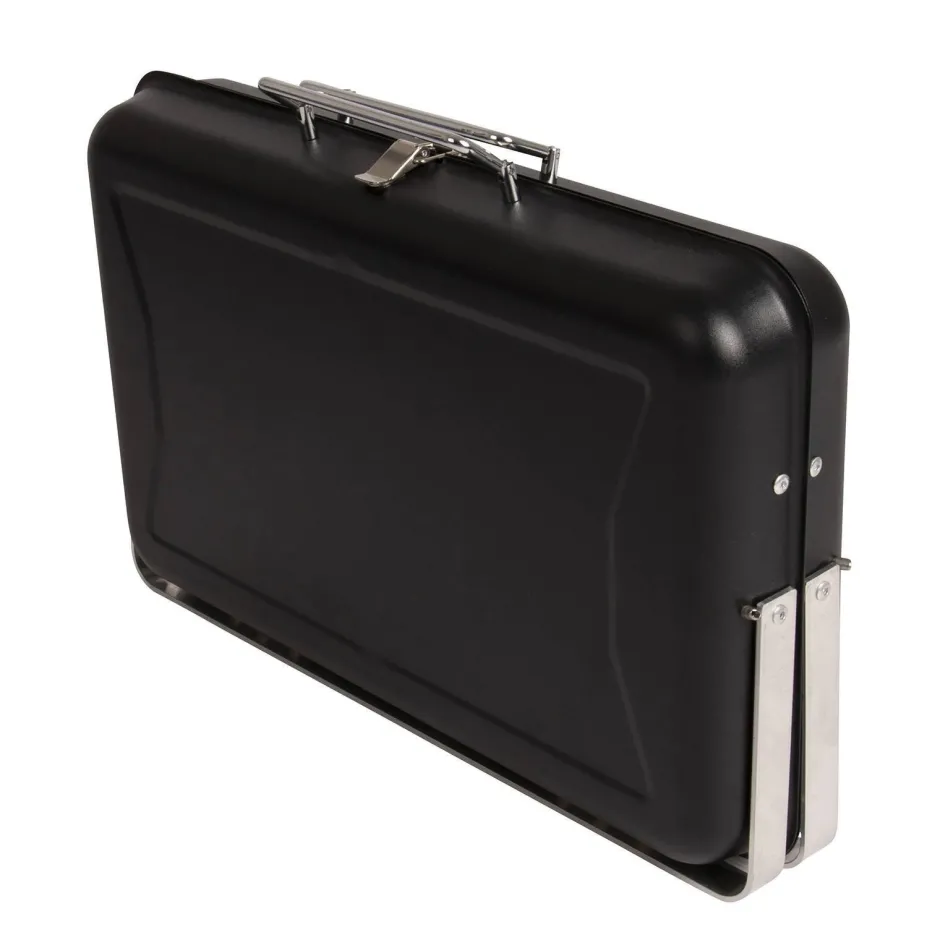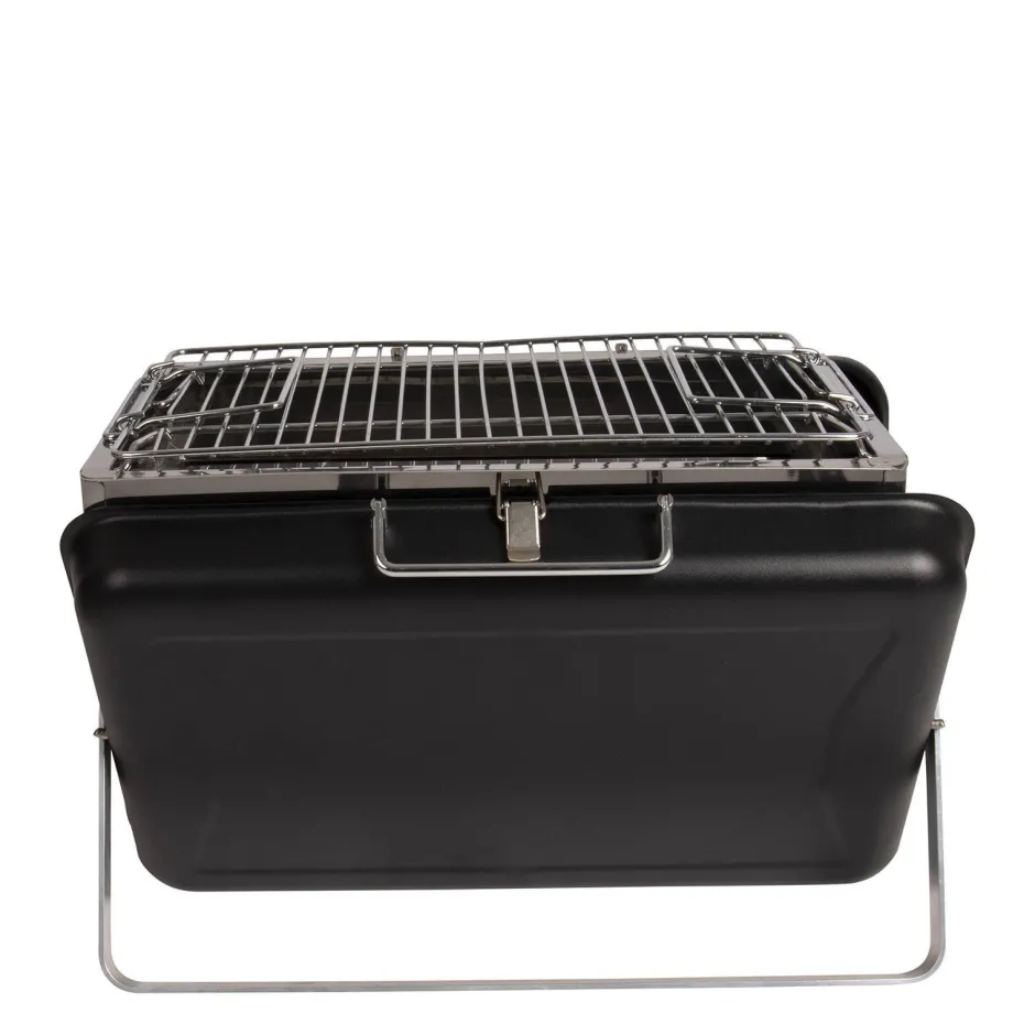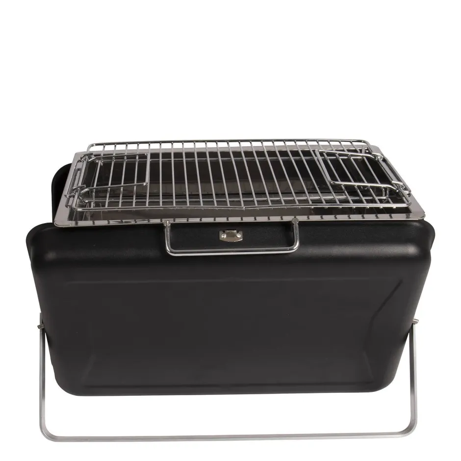 Een Zeer Compacte Houtskool Barbecue Met Industriele Uitstraling. Als Koffermodel Erg Compact Opvouwbaar (Lxbxh: 9X40,5X26 Cm) En Zeer Gemakkelijk Mee Te Nemen Met Het Handvat. Het Barbecue Gedeelte Is Gemaakt Van Roestvrij Staal. Daarnaast Is Het Rooster Omhoog Te Plaatsen Bij Teveel Warmte. Voorzien Van Ventilatiegaten Aan De Zijkanten. Ideaal Voor Op Vakantie Maar Ook Thuis In De Tuin.