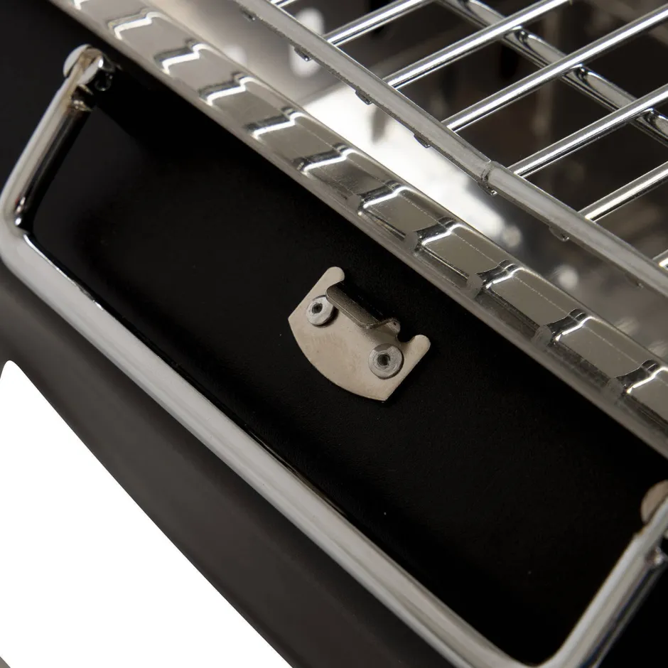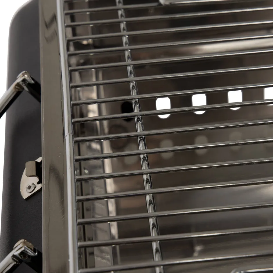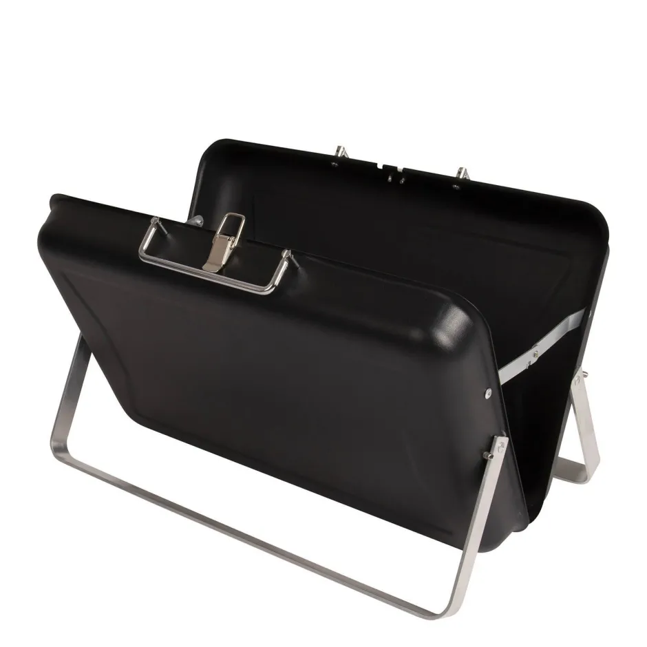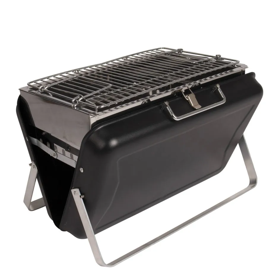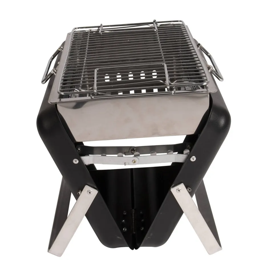Een Zeer Compacte Houtskool Barbecue Met Industriele Uitstraling. Als Koffermodel Erg Compact Opvouwbaar (Lxbxh: 9X40,5X26 Cm) En Zeer Gemakkelijk Mee Te Nemen Met Het Handvat. Het Barbecue Gedeelte Is Gemaakt Van Roestvrij Staal. Daarnaast Is Het Rooster Omhoog Te Plaatsen Bij Teveel Warmte. Voorzien Van Ventilatiegaten Aan De Zijkanten. Ideaal Voor Op Vakantie Maar Ook Thuis In De Tuin.