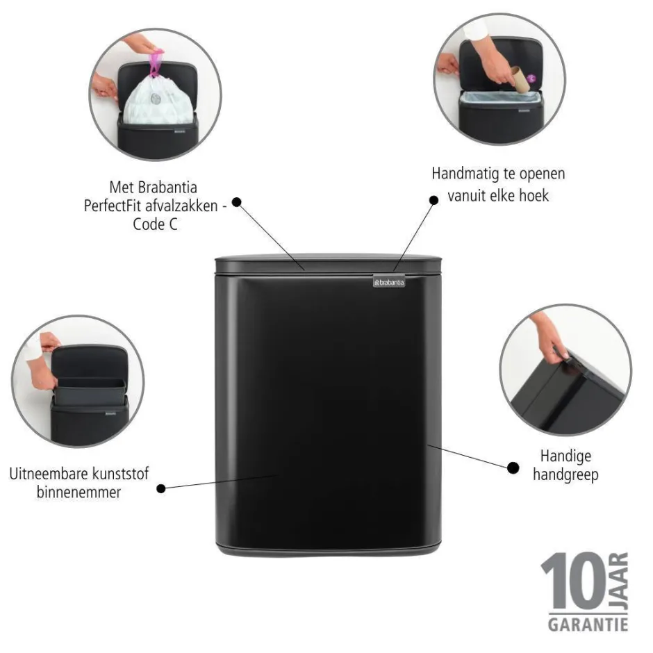 De Brabantia Bo Afvalemmer 12 Liter Is Een Behoorlijk Handige Afvalemmer. Je Opent Het Deksel Eenvoudig Vanaf De Linker-, Rechter- En Voorkant Van De Bak. Nooit Meer Je Arm Verdraaien Om Iets Weg Te Gooien. Nog Een Plus: De Ingebouwde Handgrepen Voor Eenvoudig Verplaatsen En Legen. En Dankzij Het Formaat En Design Doet Deze Prullenbak Het Goed In Elke Ruimte. Go Bo!- Ruimtebesparend – S Volume (12L).- Makkelijk Te Gebruiken – Deksel Kan Handmatig Worden Opgetild Vanaf De Linker-, Rechter- Of Voorkant.- Soepel – Zacht Sluitend Deksel.- Hygienisch – Uitneembare Kunststof Binnenemmer.- Makkelijk Verplaatsen – Transportgreep.- Glijdt Niet, Krast Niet – Zachte Antislip Onderkant.- Perfecte Combi – Inclusief Proefpakket Brabantia Perfectfit Afvalzakken (Code C).- Probleemloos Gebruik – 10 Jaar Garantie En Service.- Milieuvriendelijk – Cradle-To-Cradle®-Gecertificeerd, Brons-Niveau.- Duurzamere Keuze – Gemaakt Van 49% Gerecycled Materiaal, 98% Recyclebaar Na Gebruik.