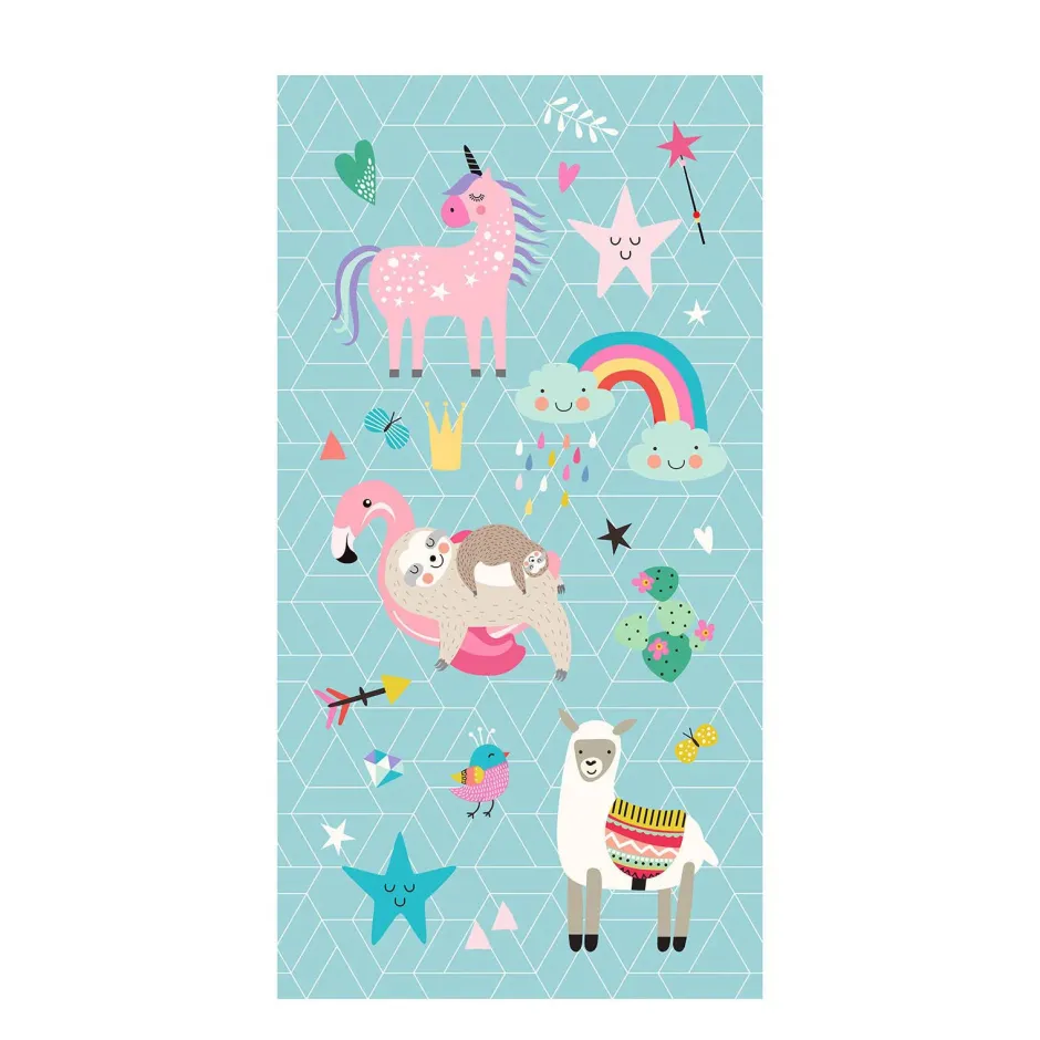Strandlaken “Moody” Van Good Morning Met Dieren En Regenbogen, In De Kleur “Aqua” Is Gemaakt Van 100% Polyvelvet. Deze Kwaliteit Is Ademend, Vocht Absorberend En Voelt Zacht En Soepel Aan.