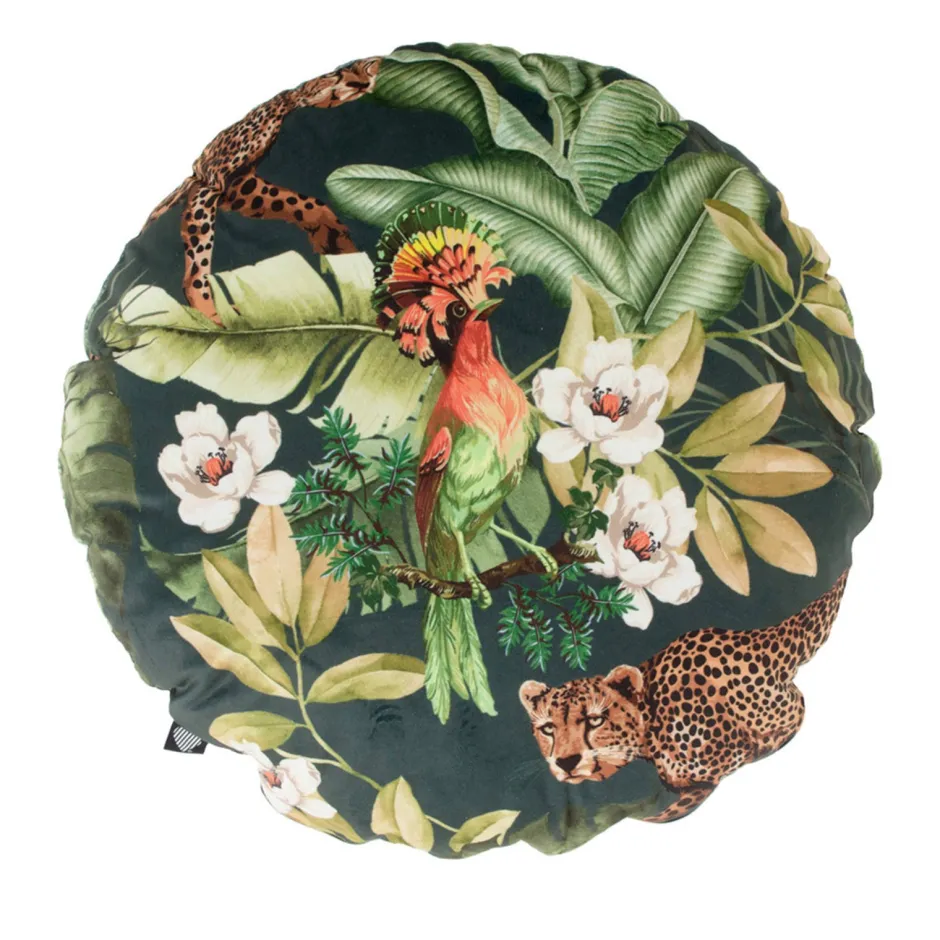 Kyra Green 40X40X12 Rondkussen – “Wij Willen Je Graag Kennis Laten Maken Met Onze Veranda Collectie. Unieke Stoffen En Uitgesproken Dessins Kenmerken Deze Serie. Velvet Is Weer Helemaal Terug Van Weggeweest, Daarom Is Deze Prachtige Stof Ook Een Onderdeel Van Deze Collectie. Het Kyra Blue Kussen Heeft Een Donkergroene Achtergrond Met Daarop Een Patroon Met Sprekende Groene Bladeren, Bloemen En Een Tijger In Het Middelpunt. Welkom In De Jungle! De Kussens Uit De Hartman Veranda Collectie Zijn Speciaal Ontworpen Voor Overdekte Buitenplaatsen.”