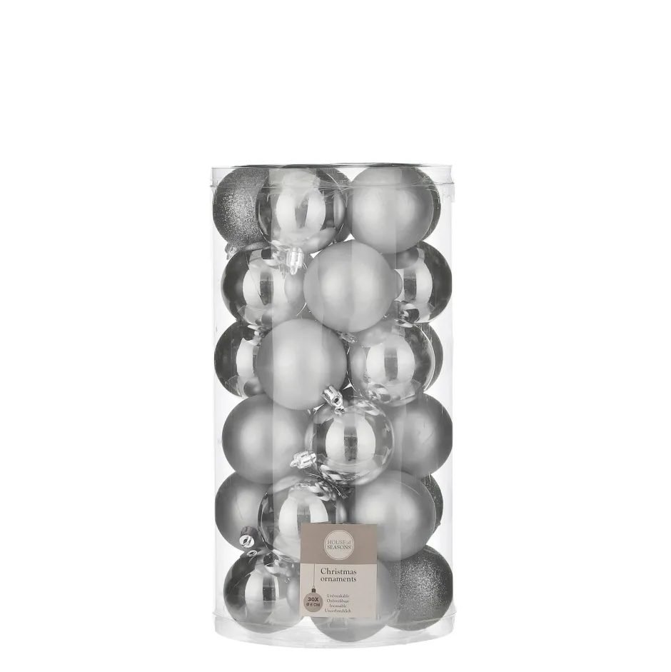 Versier De Kerstboom Met Deze Zilverkleurige Kerstboom Decoratie Van House Of Seasons En Je Hebt Er Gegarandeerd Plezier Van. De Set Bestaat Uit 30 Kerstballen Met Verschillende Afwerkingen: Van Mat Tot Mooi Glanzend. De Zilveren Kleur Zorgt Voor Een Feestelijke Sfeer Met Een Moderne Uitstraling. Daarnaast Zijn De Kerstballen Door Het Gebruik Van Plastic Ook Nog Eens Onbreekbaar. Daar Kun Je Nog Jaren Van Genieten! De Kerstballen Hebben Een Diameter Van 6 Cm En Zijn Een Goede Basis Voor Een Mooi Versierde Kerstboom.