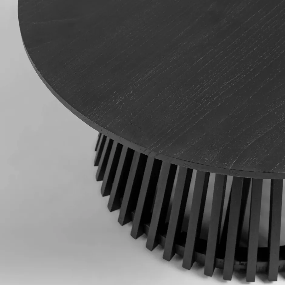 Deze Jeanette Salontafel, O80 Cm, Is Gemaakt Van Massief Mindi-Hout Met Een Zwarte Afwerking, Waardoor De Aderen Zichtbaar Worden Die Elke Tafel Exclusief Maken. De Basis Heeft Ook Een Origineel Ontwerp Van Stukken Gemaakt Met Dezelfde Houtsoort En Afwerking, Een Voor Een Geplaatst.