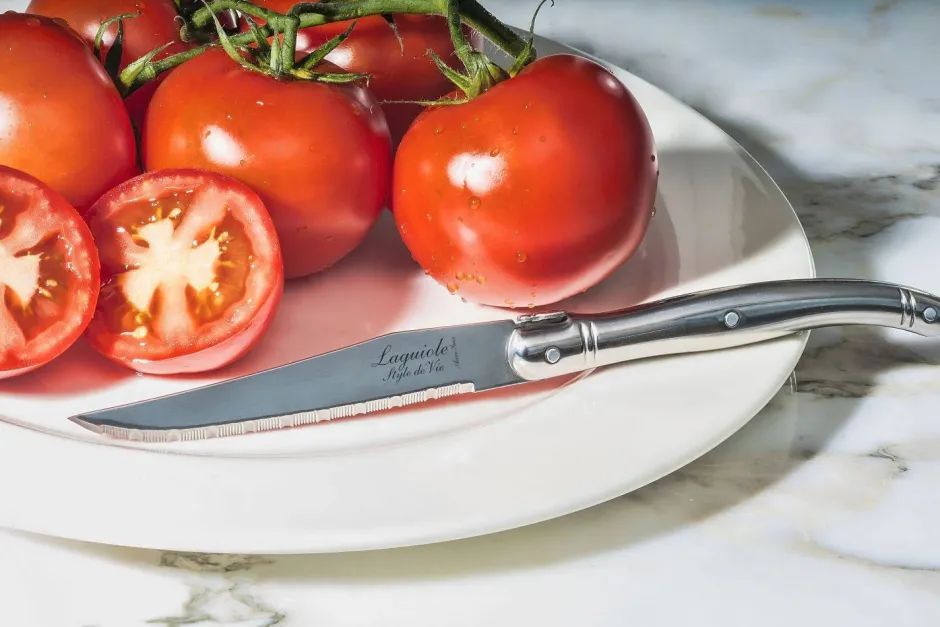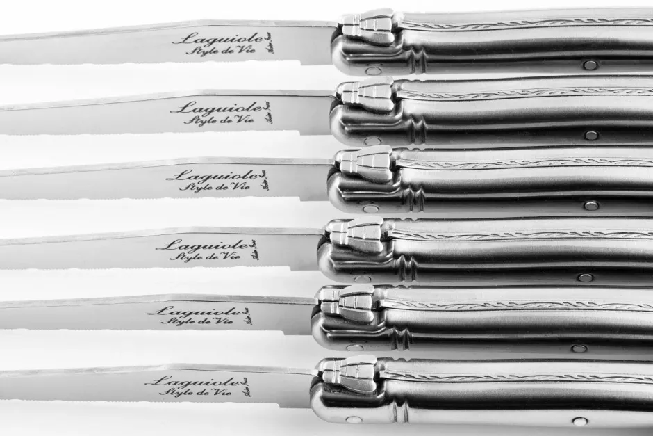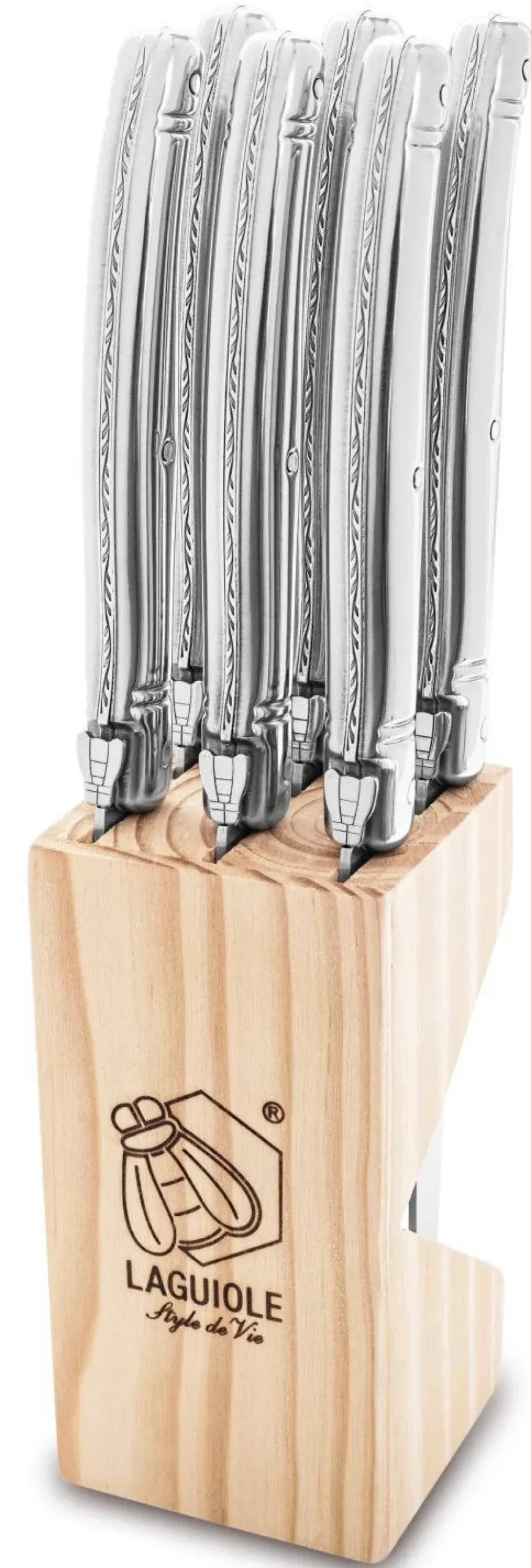 Laguiole Style De Vie Premium Line Steakmessen Bestaat Uit 6 Laguiole Steakmessen Met Gekarteld Lemmet. De Steakmessenset Van Laguiole Style De Vie Zijn Gemaakt Van Hoogwaardige Materialen Die Voor Een Luxe En Elegante Uitstraling Zorgen. De Messen Hebben Een Klassieke Vormgeving Met Het Icoon Van Laguiole Op Het Heft. De Laguiole Messenset Wordt Geleverd In Een Mooi, Stabiel En Stevig Messenblok Waardoor De Set Gelijk Een Prachtig Cadeau Is En Direct Op Het Aanrecht Geplaatst Kan Worden.Er Bestaan Meerdere Fabrikanten Van Laguiole Messen, Maar Alle Producten Van Style De Vie Zijn Voorzien Van Een Echtheidscertificaat.