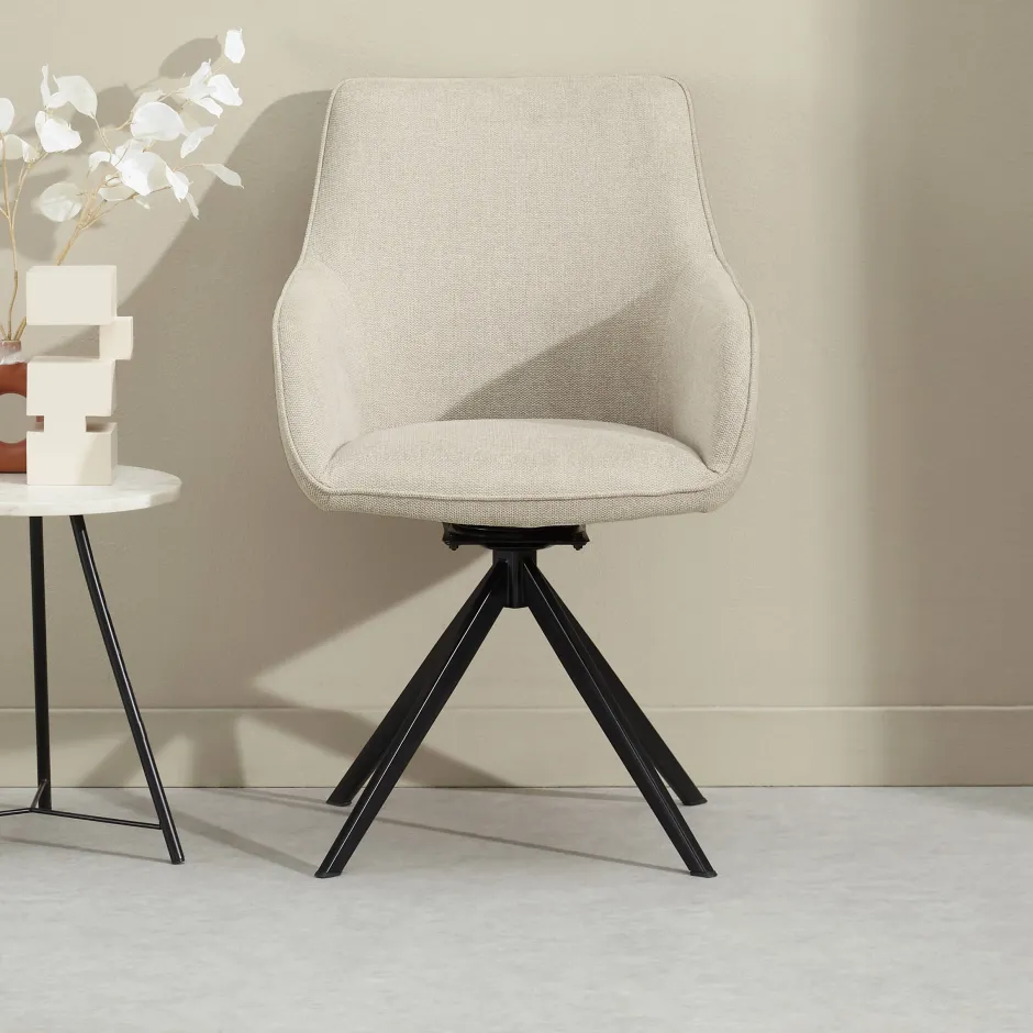 Breng Sfeer In Je Eethoek Met Eetkamerstoel Loren Van De Nous Living Collectie. Dankzij De Eigentijdse Vormgeving Is De Loren Goed Te Combineren Met Vrijwel Iedere Eettafel. De Kuip Is Bekleed Met Een Zachte Stof Van Polyester En Geven De Eetkamerstoel Een Vriendelijk Uiterlijk. Tevens Biedt De Kuip Een Optimaal Zitcomfort, Zodat Je Urenlang Comfortabel Kunt Tafelen Met Familie En Vrienden. De Loren Wordt Gedragen Door Een Stoer Metalen Onderstel Met Een Terug-Draai-Functie. Super Handig! Hierdoor Neem Je Eenvoudig Plaats Aan Je Eettafel En Draait De Stoel Weer Netjes Terug. De Stoel Is Naast De Getoonde Versie Ook Verkrijgbaar In Diverse Andere Kleuren.