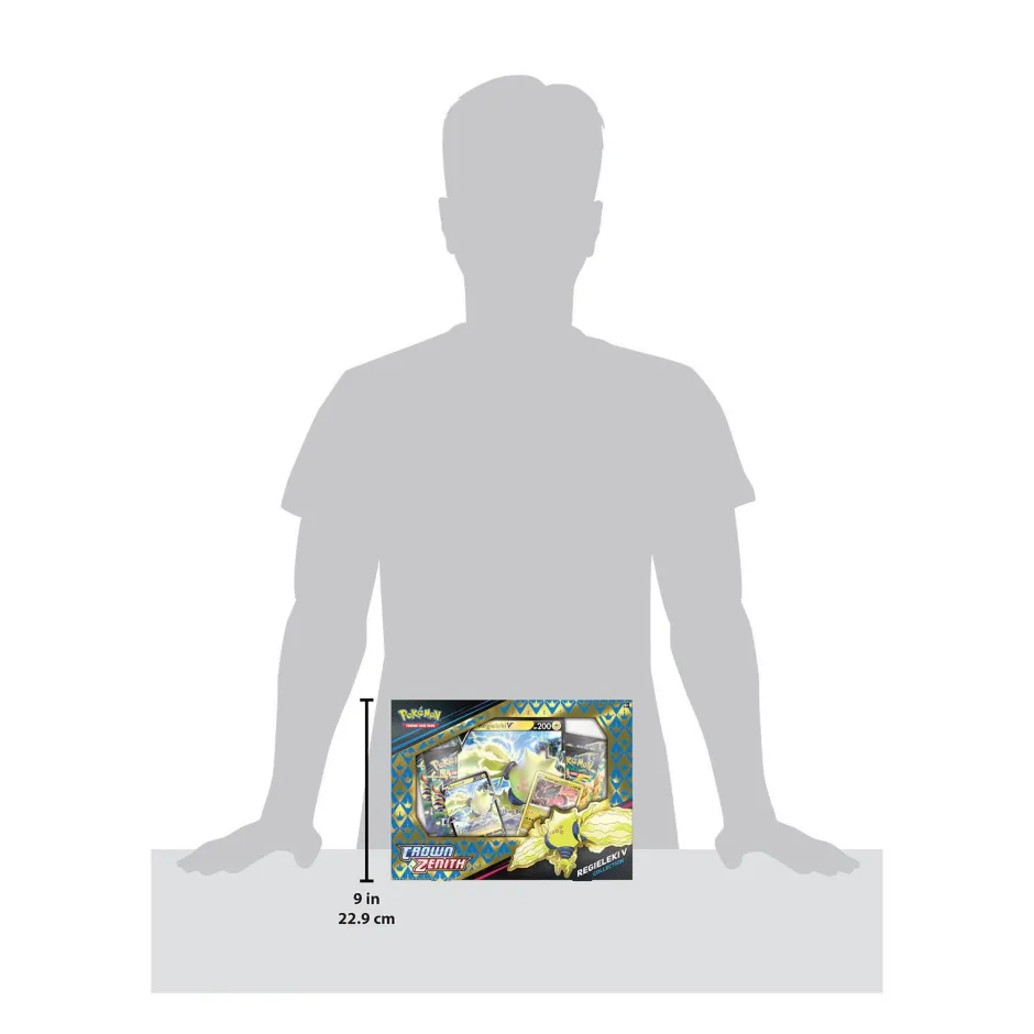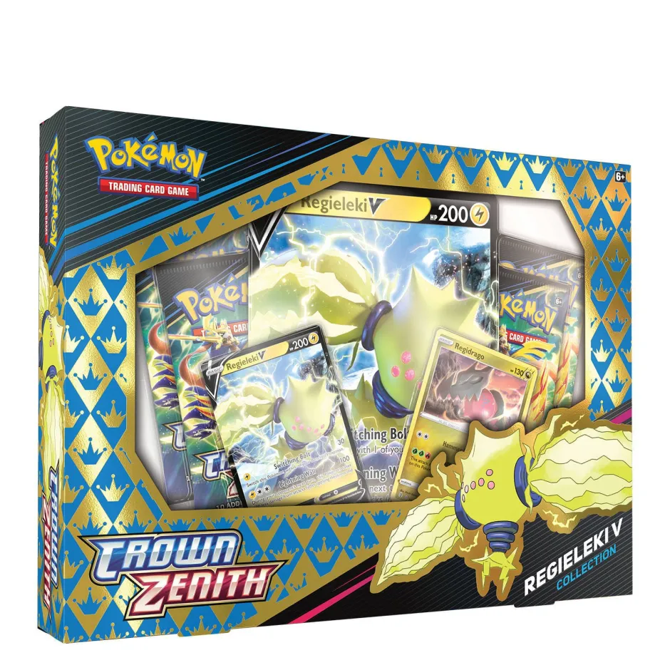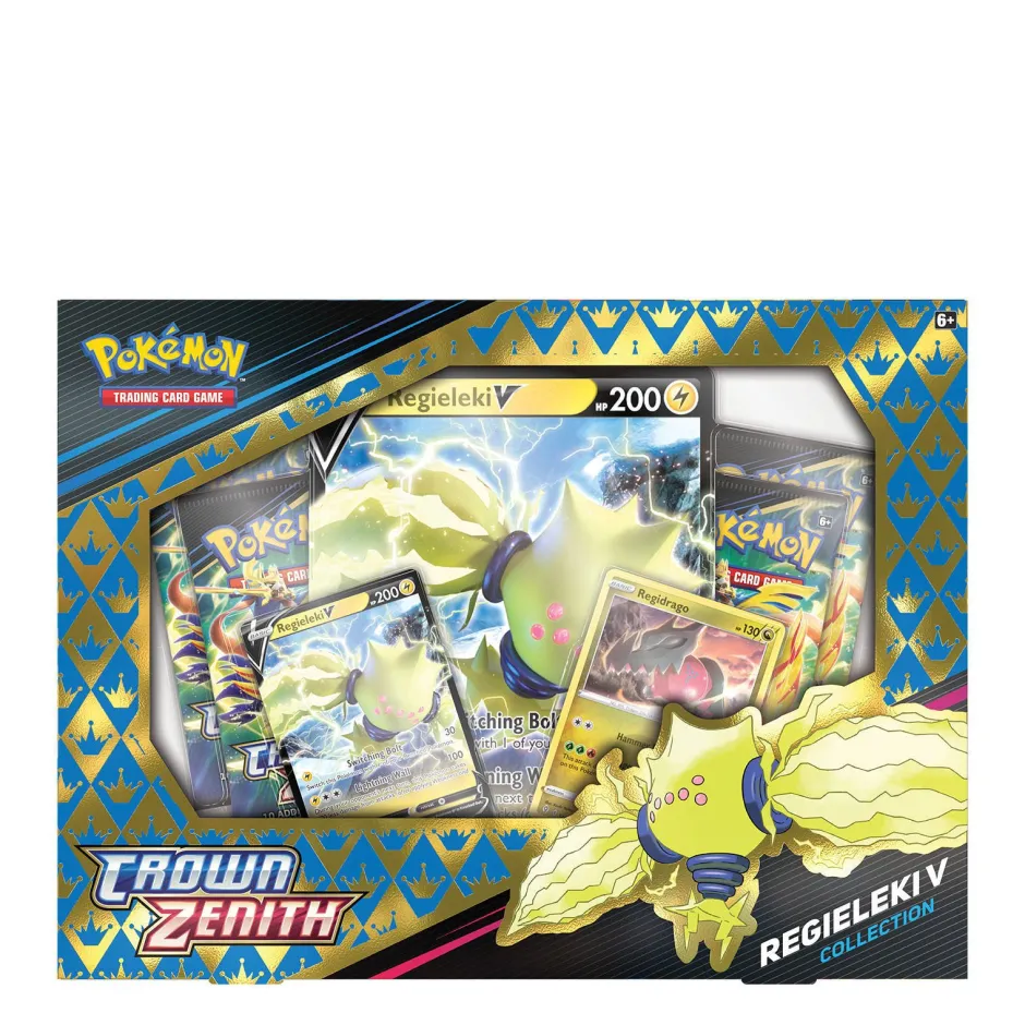 Twee Voorheen Onbekende Legendarische Pokemon Zijn Ontwaakt In De Bevroren Toendra! Ontdek De Kracht Van De Lightning-Type Regieleki Of De Dragon-Type Regidrago In Deze Twee Collecties. De Ster Pokemon Verschijnt Als Een Ready-To-Play Foil Promokaart En Een Extra Grote Kaart Voor Weergave, Vergezeld Van Een Foliekaart Met Zijn Tegenhanger En Een Handvol Boosterpacks Uit De Speciale Pokemon Tcg: Crown Zenith-Uitbreiding.