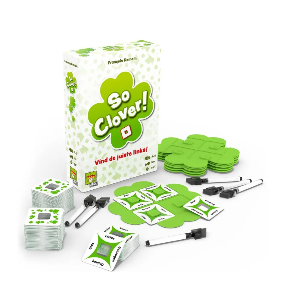 220 Kaarten Met Trefwoorden, 6 Klaverblad Spelborden, 6 Uitwisbare Stiften, 1 Scorelijst, Spelregels.