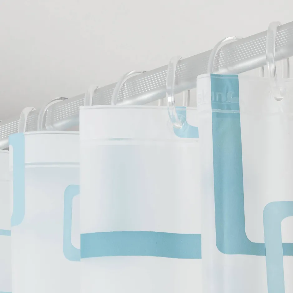 Blauwe En Grijze Tinten Met Leuke Geometrische Vormen Geven Je Badkamer Een Vrolijke Retro Look Met Het Retro Douchegordijn Van Sealskin. Het Douchegordijn Zorgt Er Natuurlijk Ook Gewoon Voor Dat De Rest Van Je Badkamer Goed Droog Blijft Tijdens Het Douchen.
