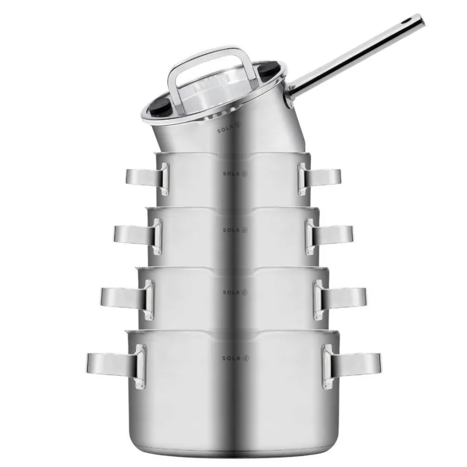 Pannenset Model Juvia Is Er Een Uit Het Topsegment Van Sola. Het Is Een Zwaardere Kwaliteit Pannenset Uitgevoerd In De Beste Staalkwaliteit Zilverwit Edelstaal 18/10. Deze Set Bestaat Uit Een Steelpan (O 16 Cm) En 3 Kookpannen (O 16,18, 20, 24 Cm. De Pannen Hebben Een Handig Vergiet In De Deksel En Tevens Voorzien Van Innovatieve Silicone Afgiet Pads. Deze Kookpannenset Is Een Echte Alleskunner In Uw Keuken.