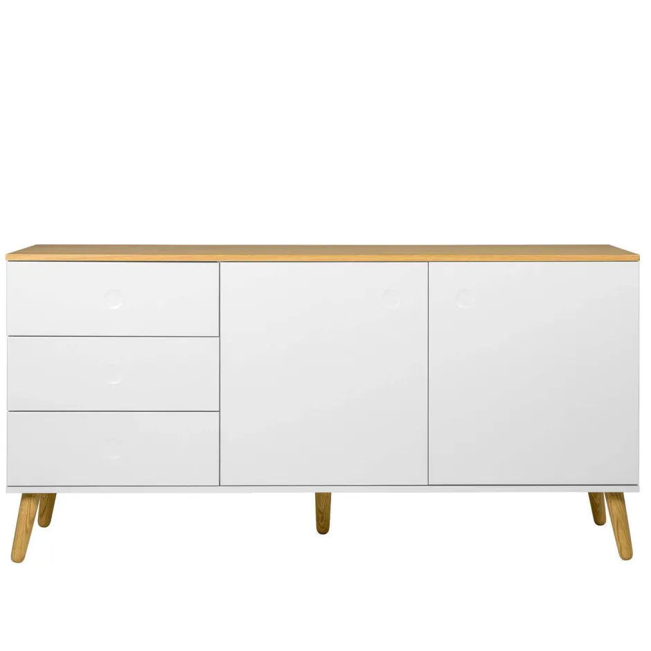 Het Dressoir Dot Is Van Het Merk Tenzo. Deze Kast Heeft 3 Laden Aan De Linkerkant En Kastruimte In Het Midden En Aan De Rechterkant. De Laden En Kastgedeelte Zijn Voorzien Van Push To Open Beslag. De Kast-En Ladefrontjes Zijn Gemaakt Van Wit Gelakt Mdf, De Bodem En Zijden Van Dit Kastje Zijn Van Spaanplaat Met Folie. Het Bovenblad Is Van Eiken Fineer En De Schuine Poten Zijn Van Massief Eikenhout.