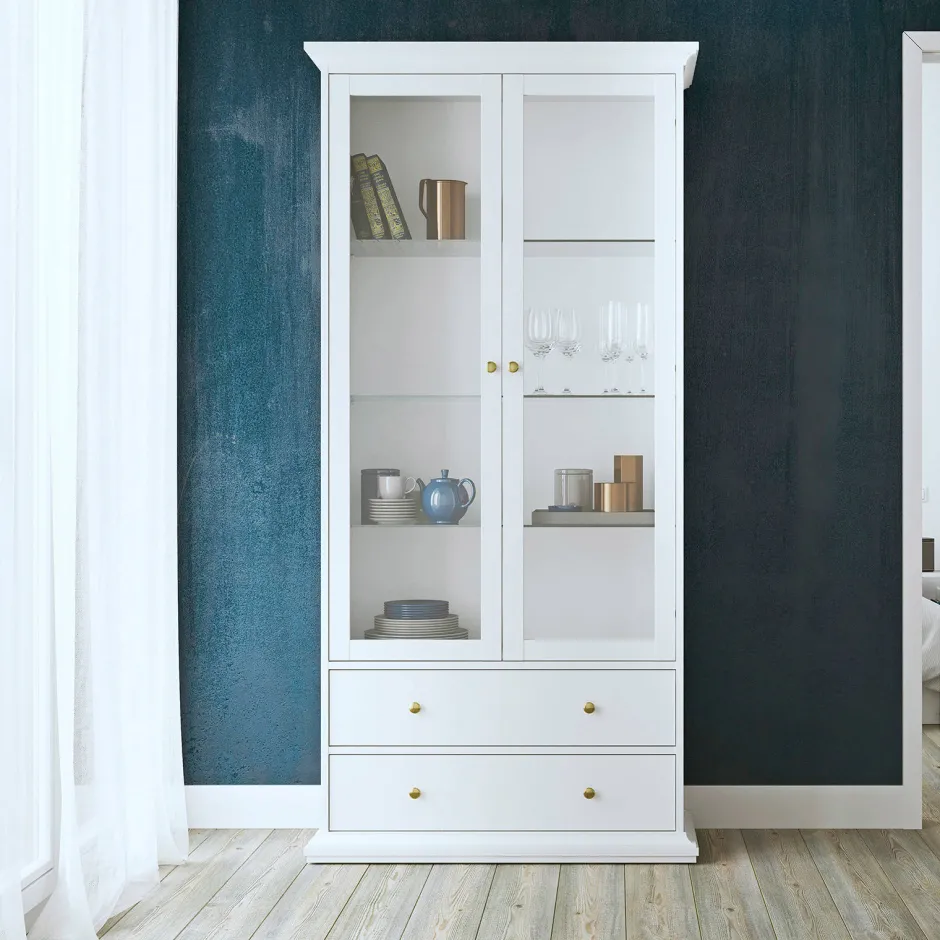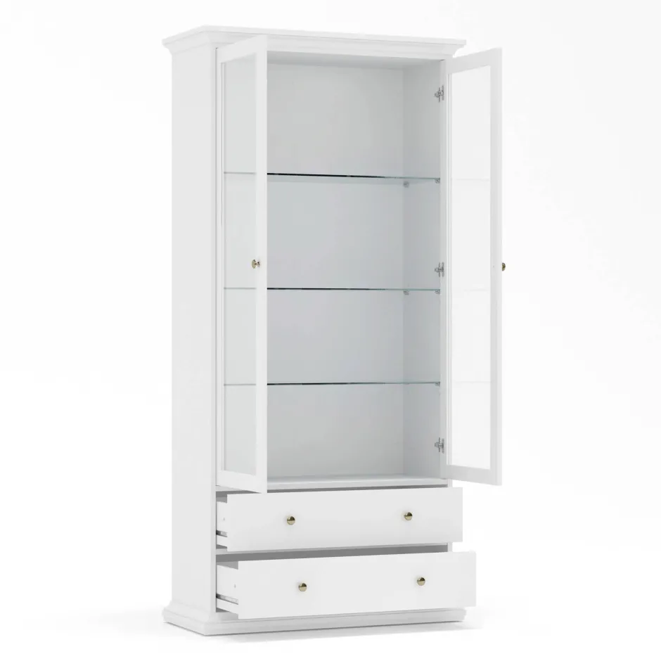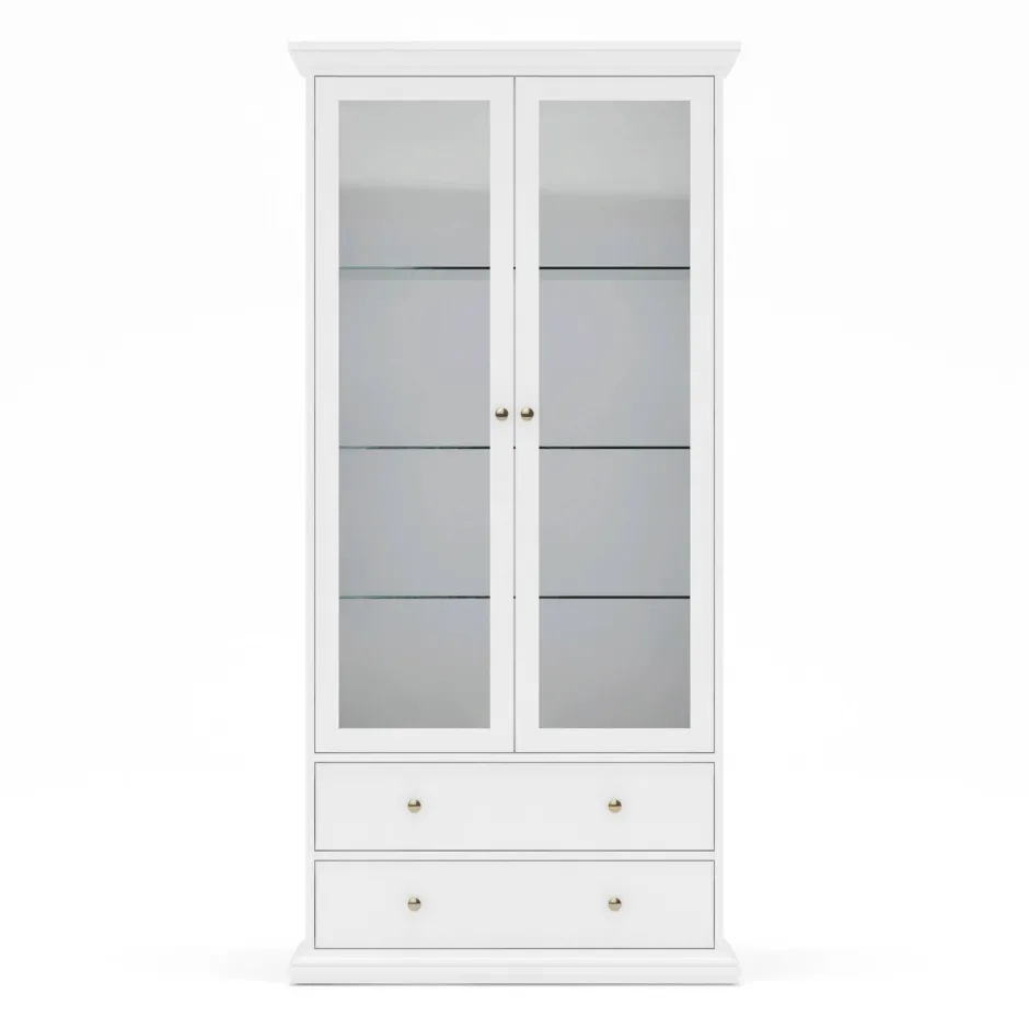 Vitrinekast Paris Heeft Twee Glazen Deuren Waarachter Je Mooiste Servies Of Woonaccessoires Prachtig Worden Uitgelicht. In De Twee Grote Lades Onderin De Kast Is Er Volop Ruimte Voor Je Andere Spullen. De Koperkleurige Deurknoppen Maken De Landelijk, Klassieke Uitstraling Van De Vitrinekast Compleet.