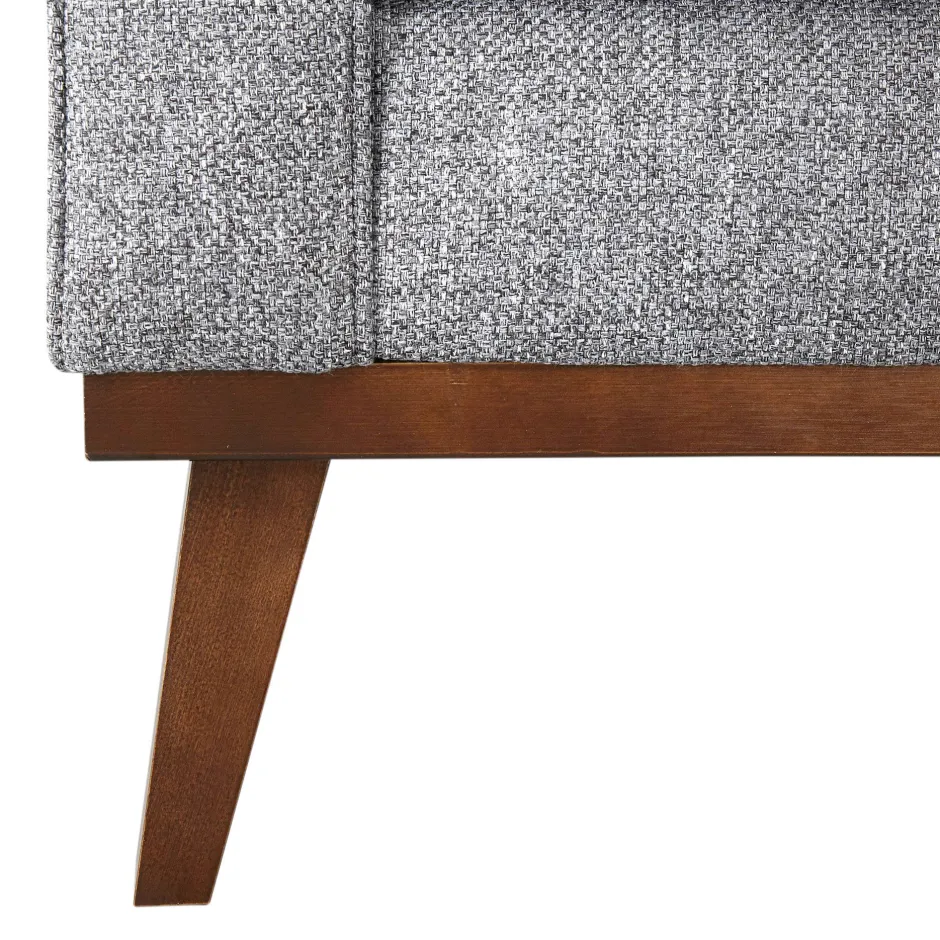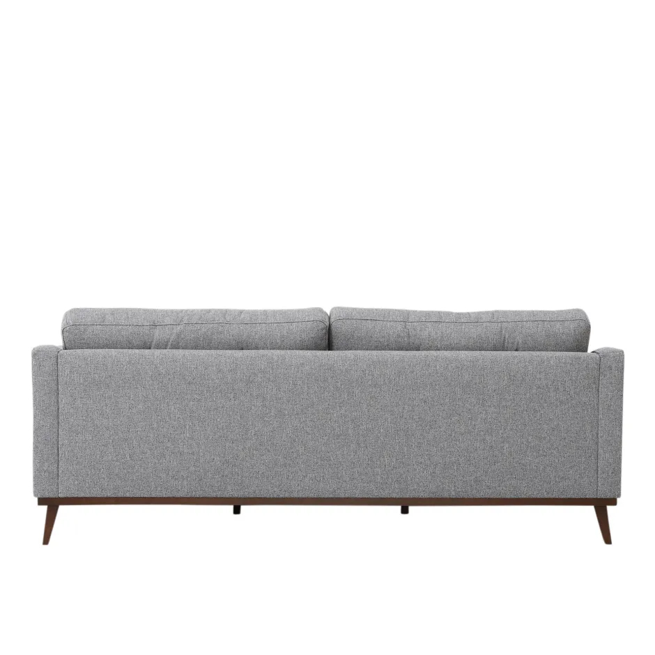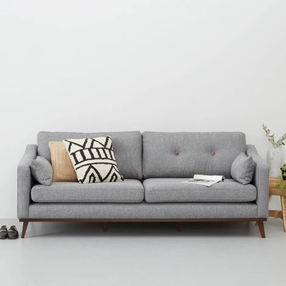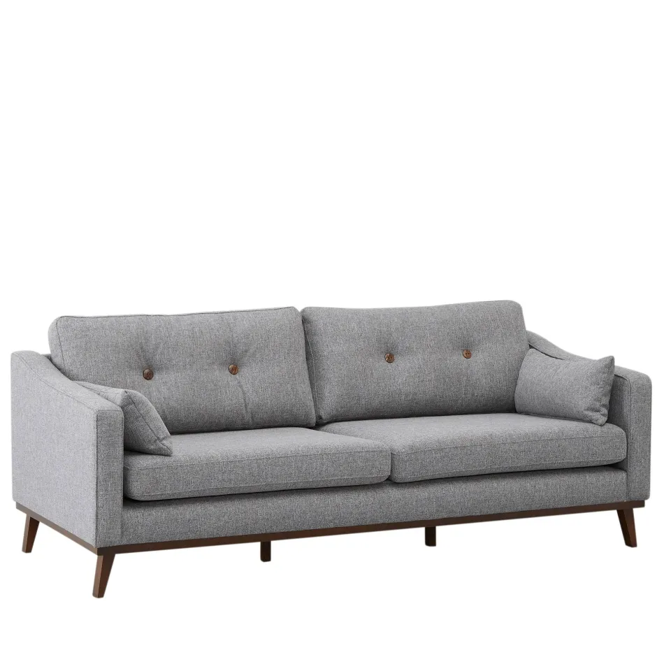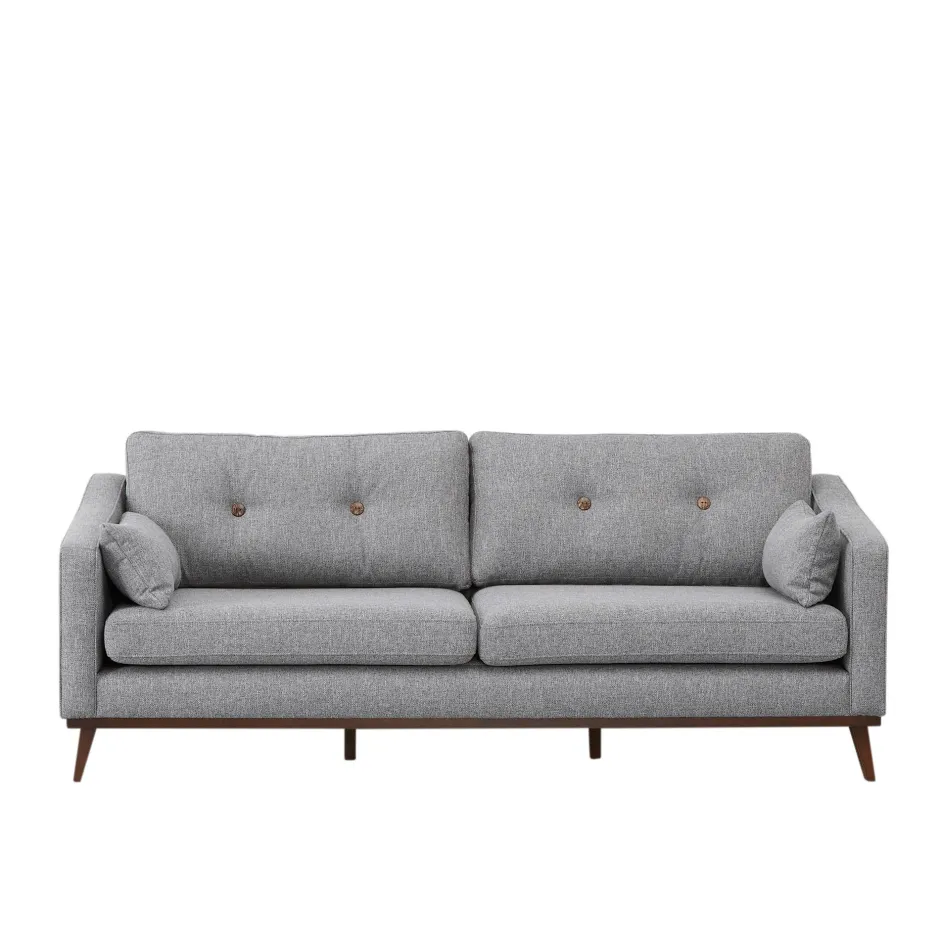 De Amalfi 3-Zitsbank Is Bekleed Met Een Zachte, Grof Geweven Tweed Stof In De Kleur Grijs. De Losse Rugkussens Zijn Gecapitonneerd Met Knopen. Deze Kussens Zijn Omkeerbaar En Hebben Aan De Ene Kant Houten Knopen En Aan De Andere Kant Knopen Die In Dezelfde Stof Als De Bank Zijn Gestoffeerd. Ook Wordt De Amalfi Met 2 Sierkussens Geleverd. Deze Maken De Bank Af En Zijn Fijn Voor Dutjes Op De Bank! De Schuingeplaatste Pootjes Van Donker Hout Dragen Bij Aan De Stijlvolle Uitstraling Van De Amalfi En Geven Een Retro Knipoog Aan Deze 3-Zitter.