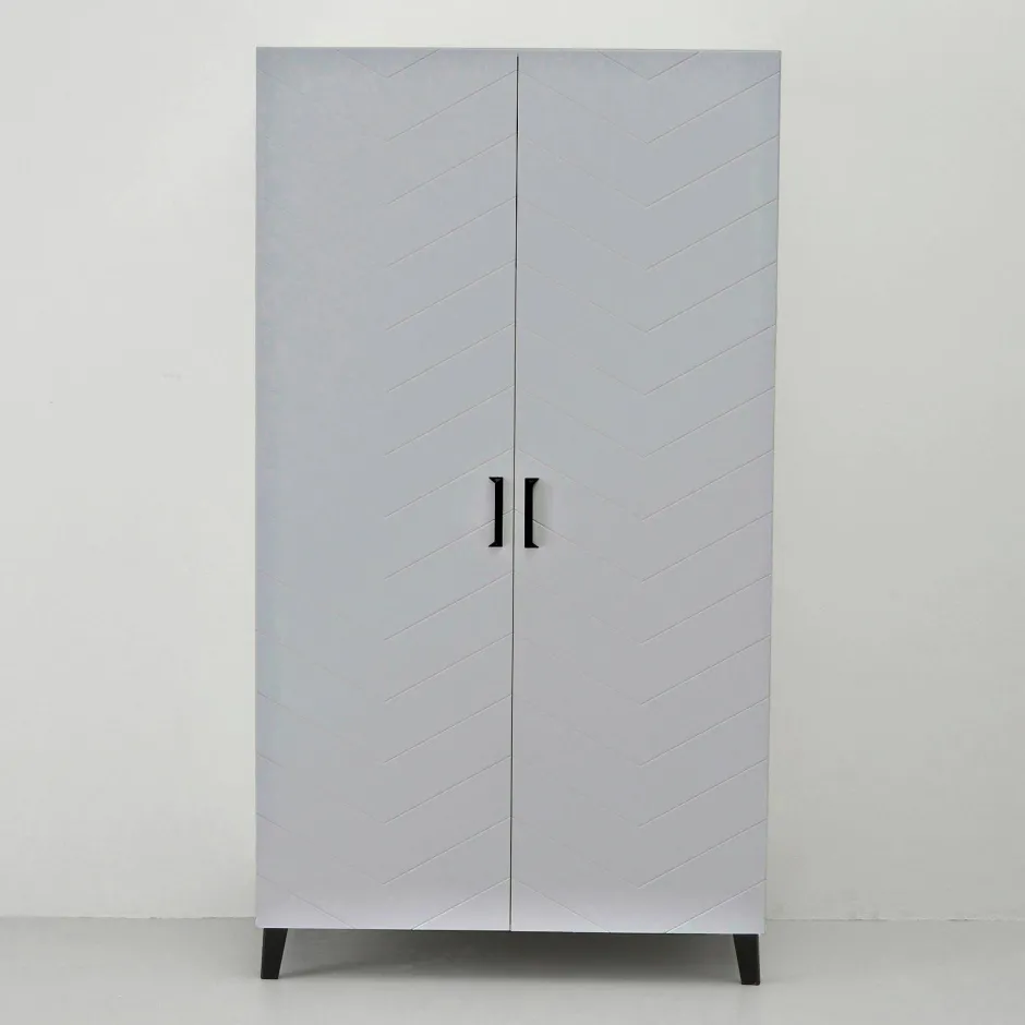 Deze Kledingkast Is Functioneel Om Te Gebruiken In De Slaapkamer En Is Ook Nog Eens Een Echte Blikvanger Door Het Stijlvolle V-Motief. De Kast Heeft Een Leg En Hanggedeelte. Genoeg Ruimte Om Al Je En Kleren En Accessoires In Op Te Bergen! De Deuren Van Kledingkast Zijn Gemaakt Van Mdf En Het Frame Van Mfc. De Kast Is Afgewerkt Met Zwart Metalen Handvaten.