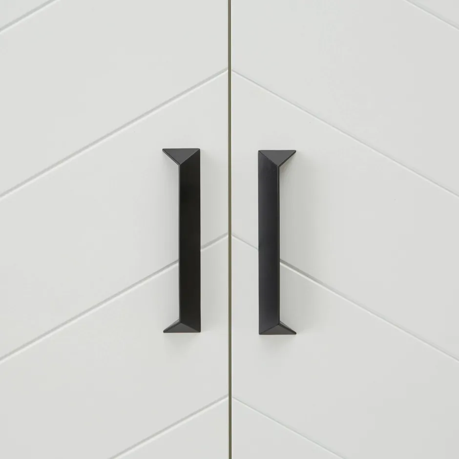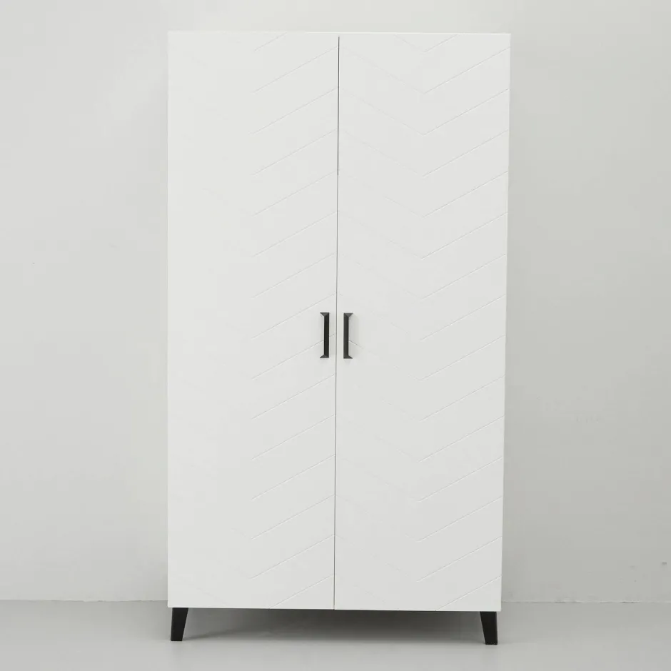 Deze Kledingkast Is Functioneel Om Te Gebruiken In De Slaapkamer En Is Ook Nog Eens Een Echte Blikvanger Door Het Stijlvolle V-Motief. De Kast Heeft Een Leg En Hanggedeelte. Genoeg Ruimte Om Al Je En Kleren En Accessoires In Op Te Bergen! De Deuren Van Kledingkast Zijn Gemaakt Van Mdf En Het Frame Van Mfc. De Kast Is Afgewerkt Met Zwart Metalen Handvaten.