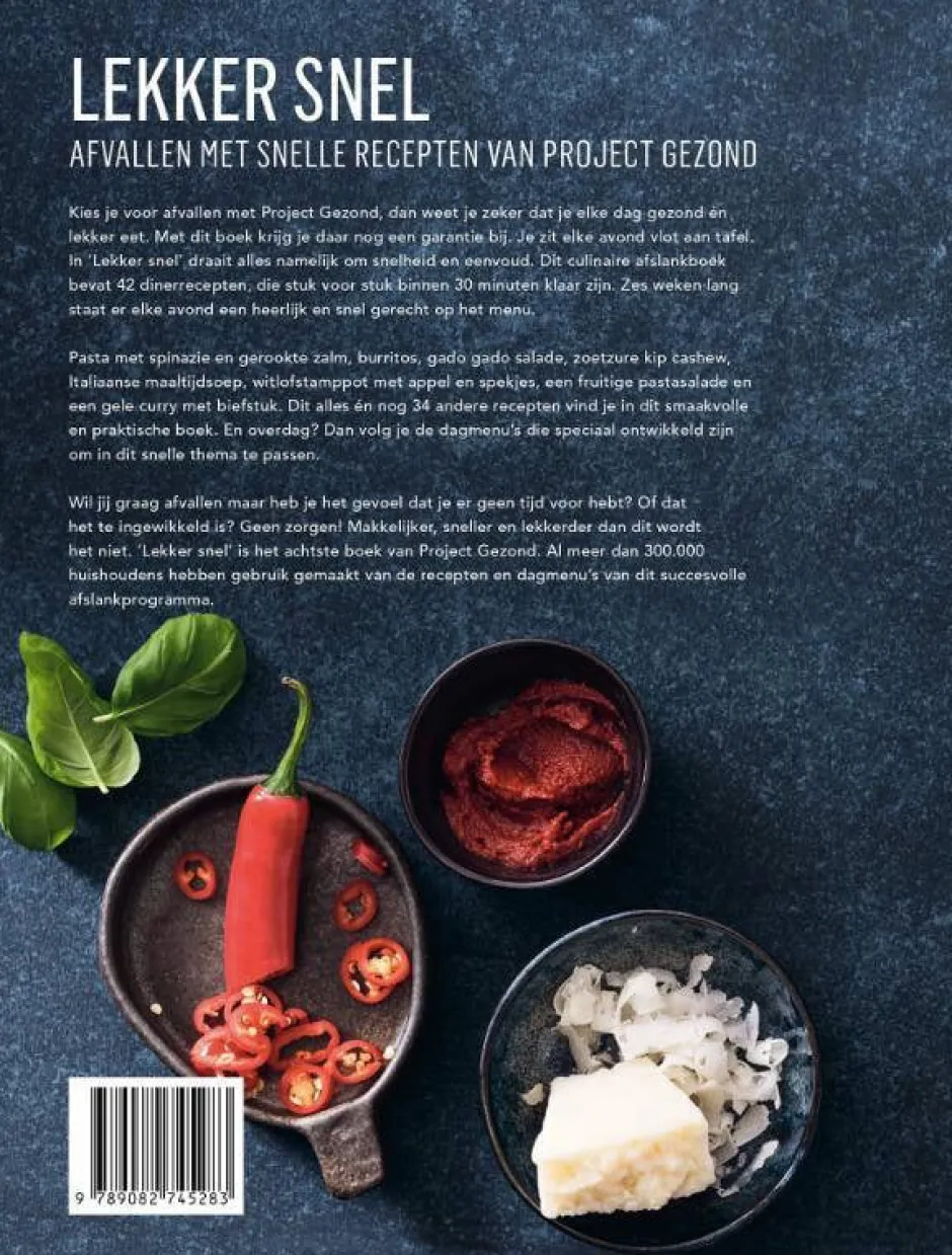 Kies Je Voor Afvallen Met Project Gezond, Dan Weet Je Zeker Dat Je Elke Dag Gezond En Lekker Eet. Met Dit Boek Krijg Je Daar Nog Een Garantie Bij. Je Zit Elke Avond Vlot Aan Tafel. In ‘Lekker Snel’ Draait Alles Namelijk Om Snelheid En Eenvoud. Dit Culinaire Afslankboek Bevat 42 Dinerrecepten, Die Stuk Voor Stuk Binnen 30 Minuten Klaar Zijn. Zes Weken Lang Staat Er Elke Avond Een Heerlijk En Snel Gerecht Op Het Menu. Pasta Met Spinazie En Gerookte Zalm, Burritos, Gado Gado Salade, Zoetzure Kip Cashew, Italiaanse Maaltijdsoep, Witlofstamppot Met Appel En Spekjes, Een Fruitige Pastasalade En Een Gele Curry Met Biefstuk. Dit Alles En Nog 34 Andere Recepten Vind Je In Dit Smaakvolle En Praktische Boek. En Overdag? Dan Volg Je De Dagmenu’S Die Speciaal Ontwikkeld Zijn Om In Dit Snelle Thema Te Passen. Wil Jij Graag Afvallen Maar Heb Je Het Gevoel Dat Je Er Geen Tijd Voor Hebt? Of Dat Het Te Ingewikkeld Is? Geen Zorgen! Makkelijker, Sneller En Lekkerder Dan Dit Wordt Het Niet. ‘Lekker Snel’ Is Het Achtste Boek Van Project Gezond. Al Meer Dan 300.000 Huishoudens Hebben Gebruik Gemaakt Van De Recepten En Dagmenu’S Van Dit Succesvolle Afslankprogramma.