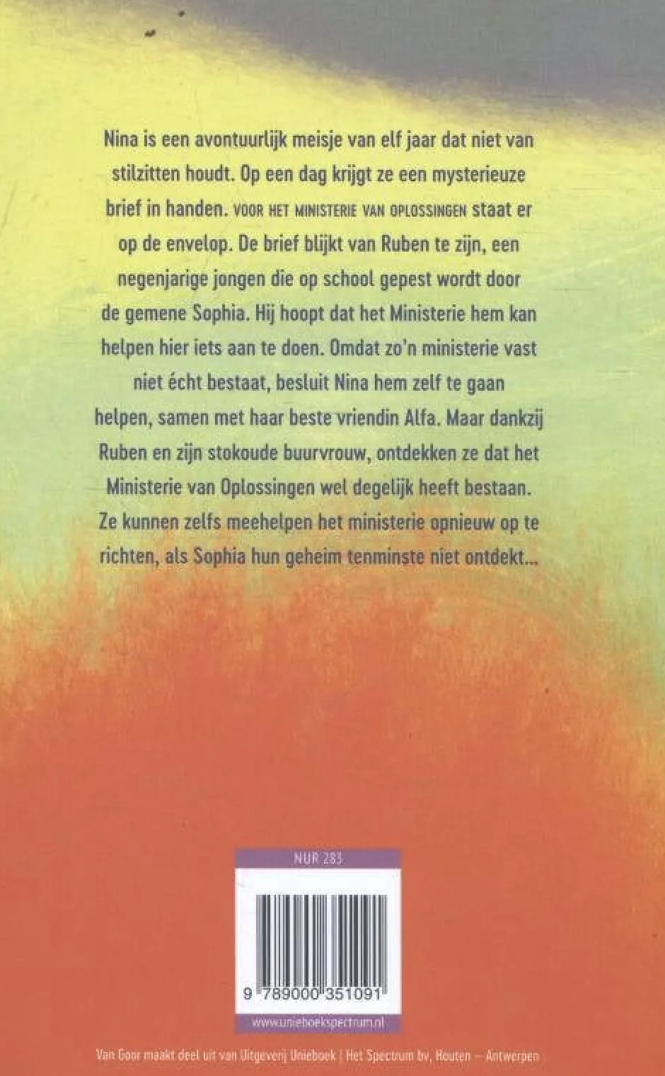 Nina Is Een Avontuurlijk Meisje Van 11 Jaar Dat Niet Van Stilzitten Houdt. Haar Vader Is Postbode En Als Hij Op Een Dag Een Brief Aan Het Mysterieuze Ministerie Van Oplossingen Mee Naar Huis Neemt, Schreeuwt Die Er Natuurlijk Om Gelezen Te Worden. De Brief Is Van De 9-Jarige Ruben Die Op School Gepest Wordt Door De Gemene Sophia En Haar Vriendinnen. Hij Hoopt Dat Het Ministerie Hem Kan Helpen Dit Op Te Lossen. Nina Besluit Dan Om Samen Met Haar Beste Vriendin, Alfa, Ruben Te Gaan Helpen, Aangezien Zo’N Ministerie Natuurlijk Niet Echt Bestaat. Maar Dankzij Ruben En Zijn Stokoude Buurvrouw Ontdekken Ze Dat Ze Zich Daarin Vergissen: Er Heeft Wel Degelijk Een Ministerie Van Oplossingen Bestaan. Ze Kunnen Zelfs Meehelpen Aan Het Opnieuw Oprichten Ervan, Als Sophia Hun Geheim Tenminste Niet Ontdekt…