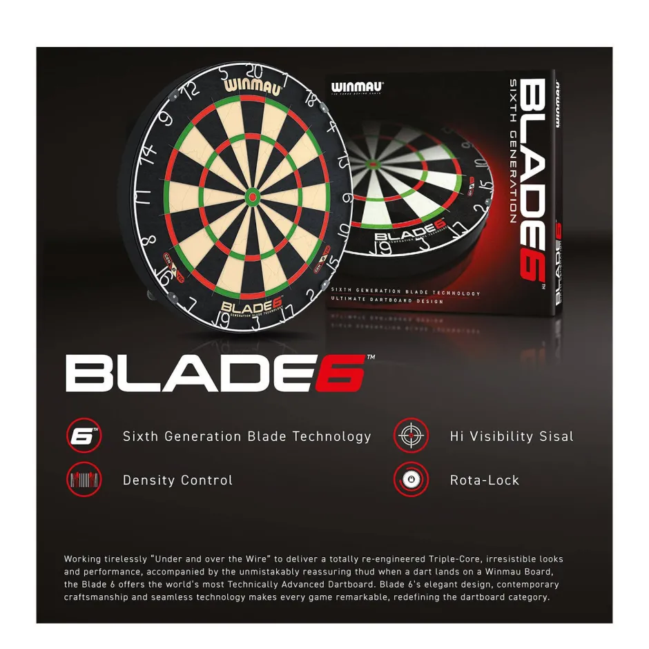 De Zesde Generatie Van De Winmau Blade Dartbord Serie Met Geweldig Design, Innovatie En Vakmanschap Met Winmau’S Nieuwste Dartbordtechnologie. Zo Is Het Blade 6 Dartbord Uitgerust Met Het Nieuwste ‘ Gepatenteerde Density Control-Draad Voor Optimale Vezeldichtheid En Verbeterde Dartretentie In De Dubbele, Treble- En Bullseye-Zones Om Optimale Scorekracht Te Verzekeren. Het Blade 6 Dartbord Is Voorzien Van Ultradun Draad Met Een Hoek Van 60 Graden, Hierdoor Buigt De Dartpijl Af In Het Scoregebied En Het Dunne Draad Zorgt Voor Minimale Bounce-Outs. De Volledig Geharde Bullseye En Buitenste Ring, Beide Met Density Control-Draad, Zijn Nu 25% Dunner. Het Blade 6 Dartbord Is Goedgekeurd Voor Professionele Toernooien En Vervaardigd Van Het Beste Oost-Afrikaanse Sisal Volgens De Officiele Specificaties Van De World Darts Federation. De Blade 6 Is Uitgerust Met Het Eenvoudig Aan Te Passen Rota-Lock Montagesysteem, En Past Op Elke Muur, Zodat Je Meteen Kunt Spelen. Het Blade 6 Dartbord Levert Hoogwaardige Spelkwaliteit En Is Ideaal Voor De Meest Veeleisende Spelers!