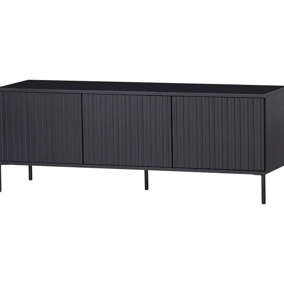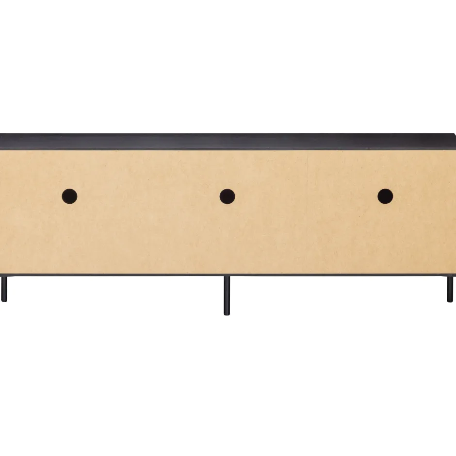 Het Gravure New Tv-Meubel Heeft Een Hoogte Van 56 Cm, Breedte Van 150 Cm En Een Diepte Van 44 Cm. De Drie Deuren Zijn Elk 37 Cm Hoog, 50 Cm Breed En 2 Cm Dik. Het Lijnenspel Op De Deurfronten Geeft De Gravure Zijn Aantrekkelijke, Herkenbare Uiterlijk. Achter De Drie Deuren Bevinden Zich Zes Afgeschermde Vakken Van 18X50X42 Cm (Hoogte X Breedte X Diepte). Het Metalen Onderstel Heeft Een Hoogte Van 15 Cm En Iedere Poot Is O 2 Cm. Achter Iedere Deur Is Een Cirkel Uitgevreesd Voor De Bedrading (O 50 Cm), Deze Is Vanaf De Grond Gemeten 40 Cm Hoog.