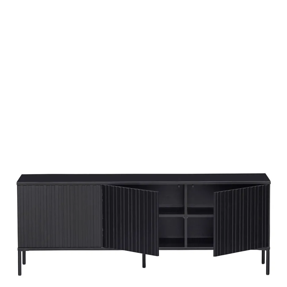 Onze Succesvolle Gravure Serie In Een Nieuw Jasje! Dit Gravure New Tv-Meubel, Uit De Collectie Van Het Nederlandse Interieurmerk Woood, Is Verkrijgbaar In Twee Formaten: 100 Cm Breed En 150 Cm Breed. Gravure New Tv-Meubel Is Uitgevoerd In Grenenhout En Afgewerkt Met Een Diepzwarte Lak. Het Interieur Is Vervaardigd Uit Spaanplaat In Zwart. De Poten Zijn Van Metaal Met Een Zwarte Coating. Het Gravure New Tv-Meubel Beschikt Over Drie Deuren Met Een Geluidloos Push-To-Open Systeem.