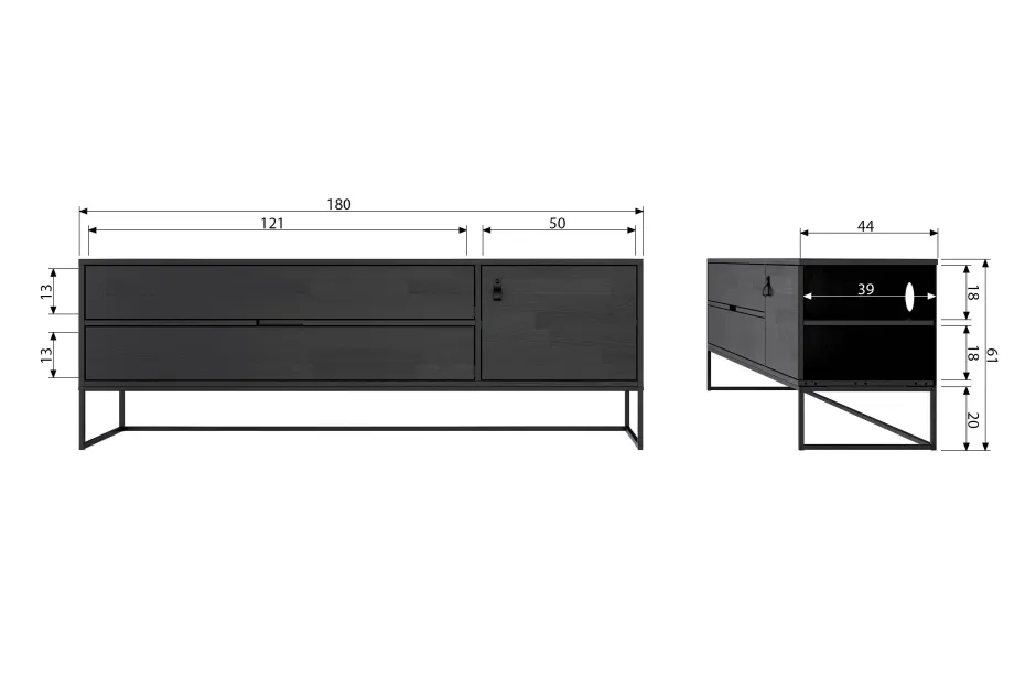 Het Silas Tv Meubel Is Een Eigen Fabricaat Van Het Nederlandse Merk Woood. Het Silas Tv Meubel Is Gemaakt Van Massief Essen (Fsc-Gecertificeerd) Met Een Geborstelde Afwerking, Dat Is Afgelakt In De Kleur Blacknight. Het Onderstel, Hoogte 20 Cm, Is Gemaakt Van Koud Gerold Staal En Is Afgewerkt In Een Zwarte Kleur. Het Silas Tv Meubel Heeft Een Hoogte Van 60,5 Cm, Een Breedte Van 180 Cm En Een Diepte Van 44 Cm. De Twee Lades Hebben Een Breedte Van 121 Cm En Een Hoogte Van 13 Cm. Het Kastje Aan De Rechterkant Heeft Een Legplank (Van Spaanplaat) En Wordt Afgesloten Met Een Deur, Hxb 37X50,1 Cm Met Leertje. De Afmetingen Van Dit Gedeelte Zijn Hxb 41X50 Cm. Het Tv Meubel Is Voorzien Van Een Gat Voor Het Wegwerken Van Kabels.